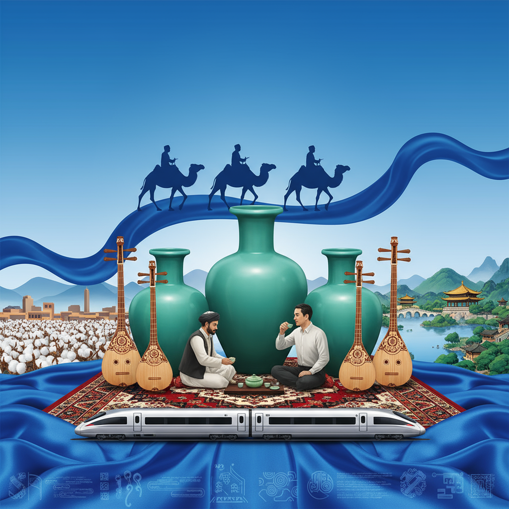 本作品整合了传统丝路元素(骆驼商队、十二木卡姆、青瓷瓶、和田地毯)与现代元素(高...