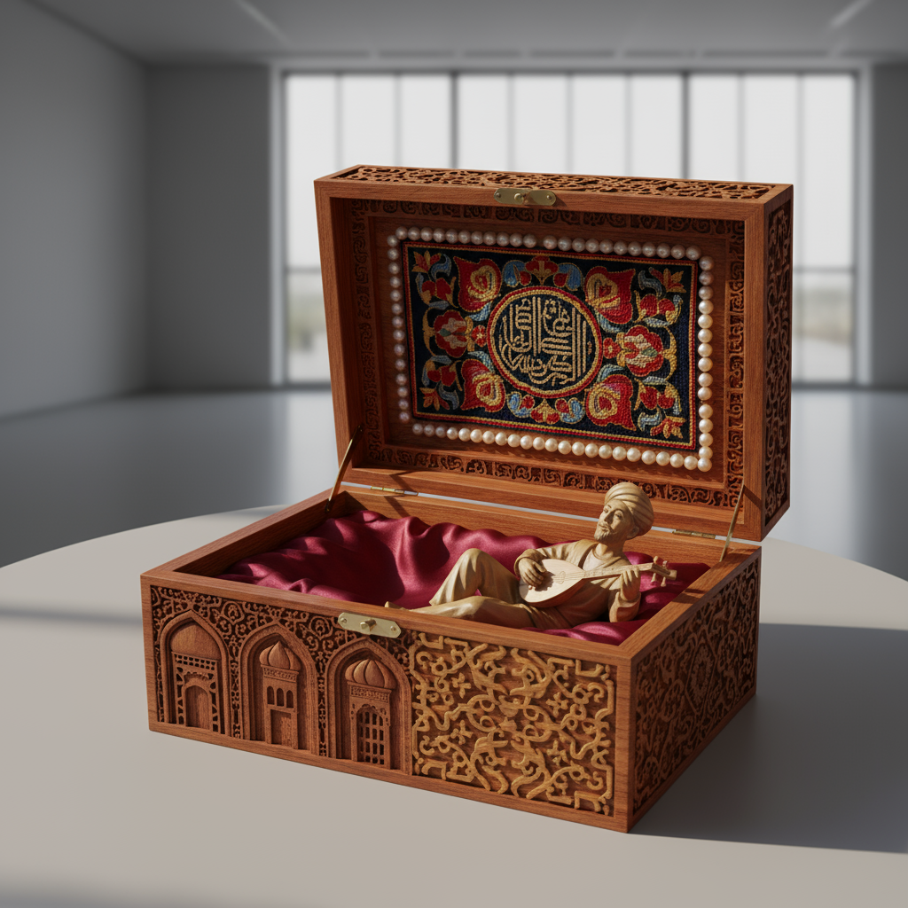 这件工艺匣以浙江的木雕工艺,木雕采用传统镂空雕花技法,纹饰还原阿克苏建筑(拱门、...