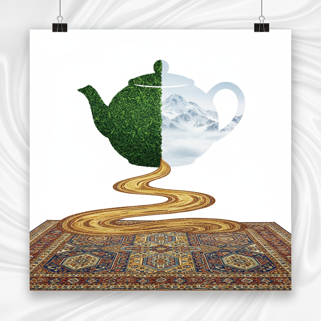 作品以茶壶为载体,壶身融合浙江元素(龙井茶园、青瓷纹饰)与阿克苏符号(雪山风貌、...