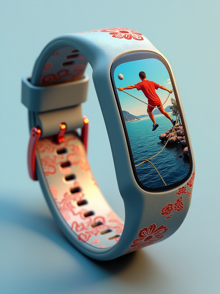 创作一款融合浙江与阿克苏传统体育元素的运动手环,此款运动手环将浙江舟山渔民画的活泼风格与阿克苏达瓦孜(高空走索)的惊险刺激巧妙结合,手环表面绘制浙江温州南麂岛的海岛风光,以鲜艳色彩展现海洋魅力;内侧则呈现阿克苏达瓦孜表演者的矫健身姿,用细腻线条勾勒动作之美。手环扣采用浙江龙泉宝剑造型设计,显示屏下方装饰阿克苏维吾尔族传统运动图案,整体既融合两地体育文化,又激发运动热情。