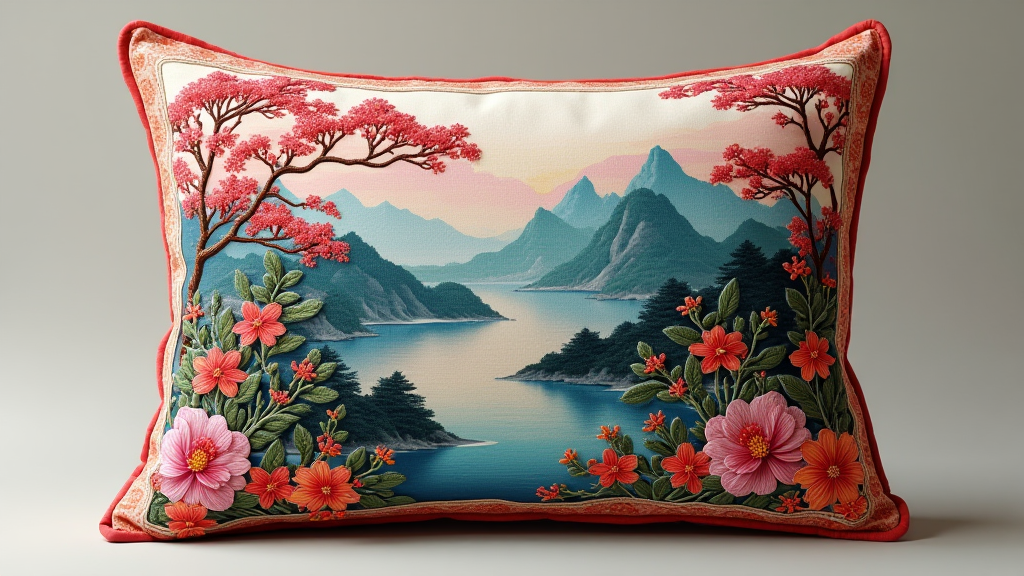 创作一款融合浙江与阿克苏刺绣元素的抱枕,此抱枕以浙江苏绣的细腻精致与阿克苏维吾尔...
