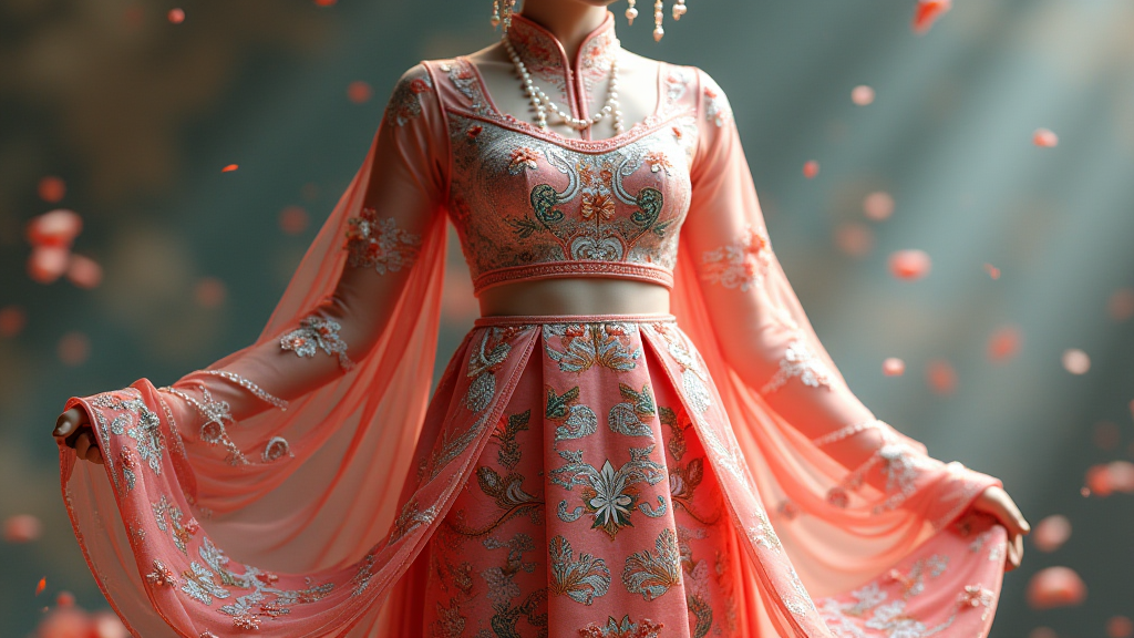 创作一款融合浙江与阿克苏舞蹈元素的服饰,此服饰以浙江傣族孔雀舞的轻盈飘逸与阿克苏维吾尔族舞蹈的热情奔放为设计灵感,上衣采用浙江丝绸制作,绣制孔雀开屏的华丽图案;下裙则选用阿克苏棉布,绘制维吾尔族舞蹈的动态场景。服饰配饰包括浙江珍珠项链与阿克苏银饰耳环,整体既展现两地舞蹈文化的独特魅力,又体现服饰设计的时尚与优雅。