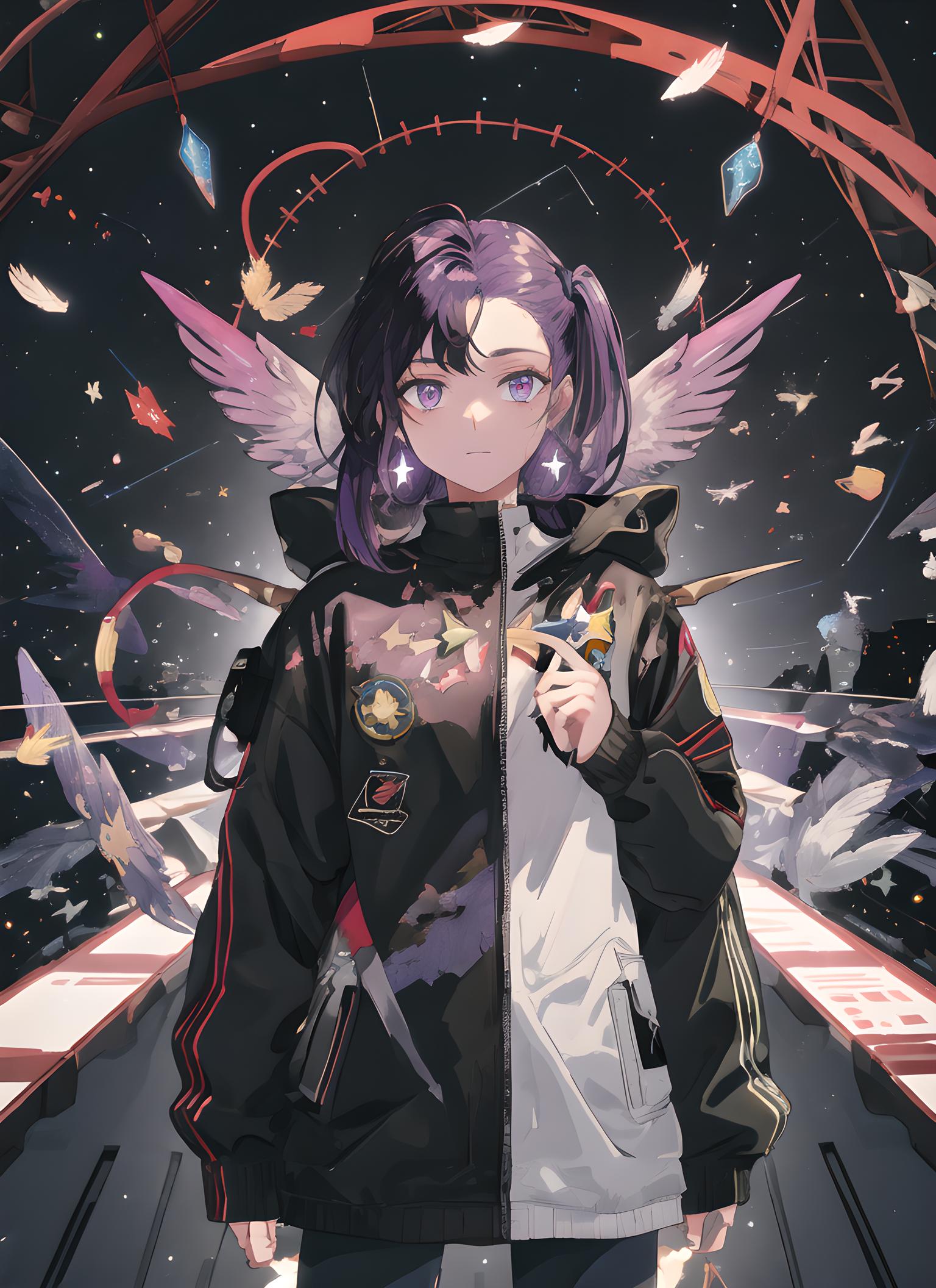 1girl,badge,black_hair,choker,city_lights,cowboy_shot,demon_wings,earrings,fake_wings,feathered_wings,jacket,jewelry,light_particles,long_sleeves,makeup,mechanical_wings,mini_wings,night,night_sky,purple_eyes,purple_hair,shooting_star,sky,solo,space,star_(sky),starry_sky,twintails,wings