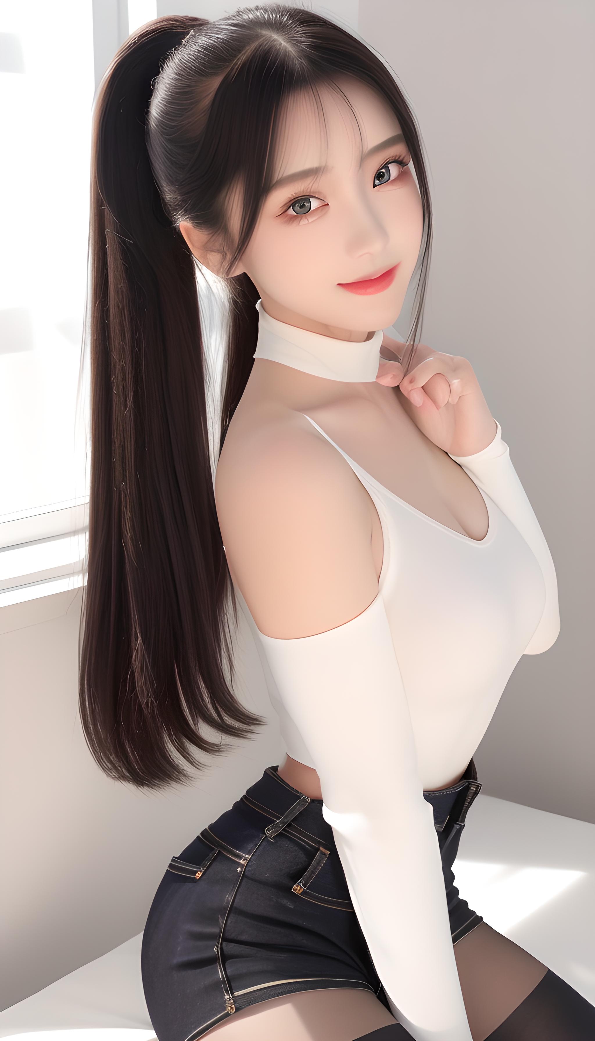 咒语(Prompt): 高清,美少女,8k画质,最佳画质,巨胸,翘臀,背对观众,回眸,对镜头微笑,妩媚温柔,背影,丰满(((黑色超短裤))),(((黑色牛仔短裤))),(((黑色裤袜))),露腿,完美身材,S型,完美身材比例,完美腿部线条,细腰,精致五官,非常可爱,水汪汪的大眼睛,紫色瞳孔,眼影,长睫毛,脸红,红色嘴唇,,银白的头发,全身特写,(现代),超现实,阳光明媚,细节光线,优雅的姿势,(latex dress,hotpants,tank top),((grey_pantyhose)),细节丰富,微笑,害羞,可爱,动人美女,8k分辨率,超高分辨率,一个16岁稚嫩少女可爱的少女,彩色清澈眼眸,顺滑的头发,高马尾,锁骨,精致完美的五官,最美的大眼睛,长睫毛,眼睛甜美有卧蚕,微笑,动态角度,极致画质,最高精度,精确完美的人体结构,(粉色超薄露肩针织毛)高腰牛仔裤,站姿