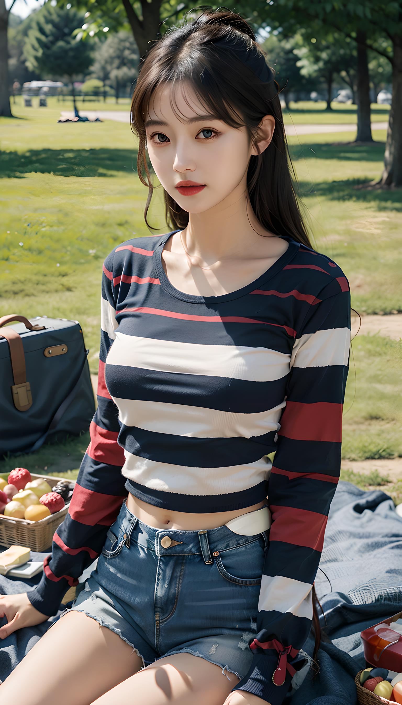 更高质量职业女性异色瞳公主卷丝带饰边上半身,(条纹长袖上衣:1.5),(牛仔短裤:1.4),(野餐公园背景:1.4)