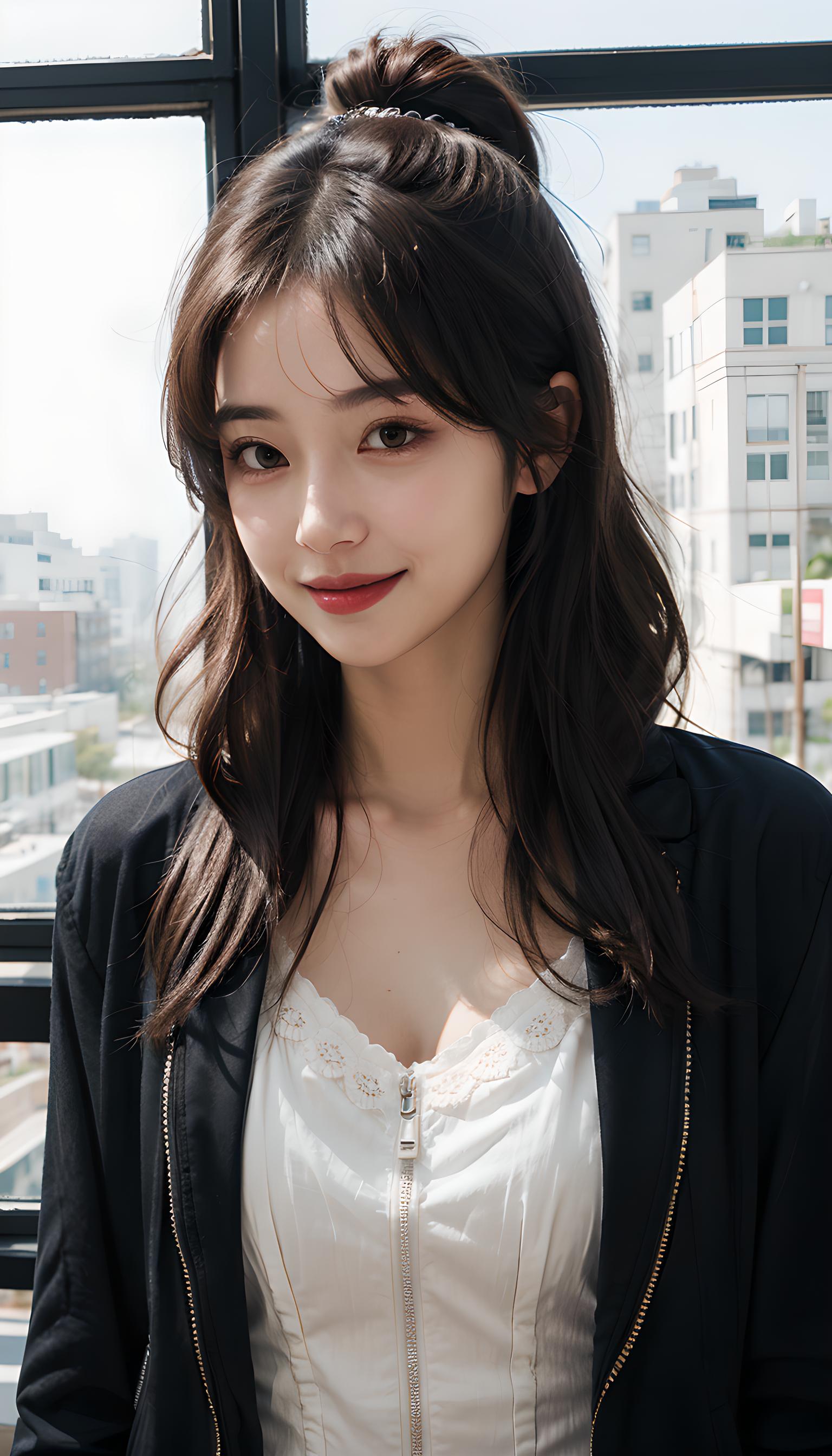 大师作品最好画质RAW照片美丽的女孩诱人笑容凌乱发洛丽塔发饰第一人称视角漏光光效高剪裁夹克下摆厚重正面系带细节