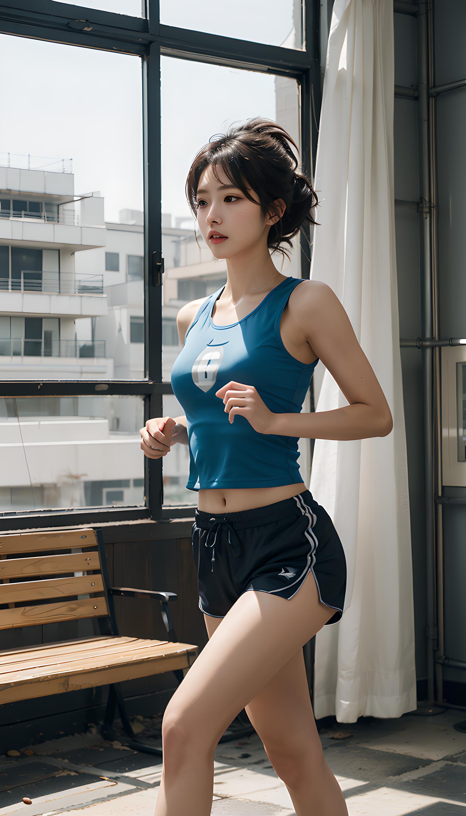 大师作品,极其详细的刻画,七分身镜头,1人,(年轻女孩:1.2),瘦的身材,跑步短裤,性能背心,跑鞋,庄严,容光焕发,棕色的眼睛,蓝色的头发,银戒指,蓬巴杜发型