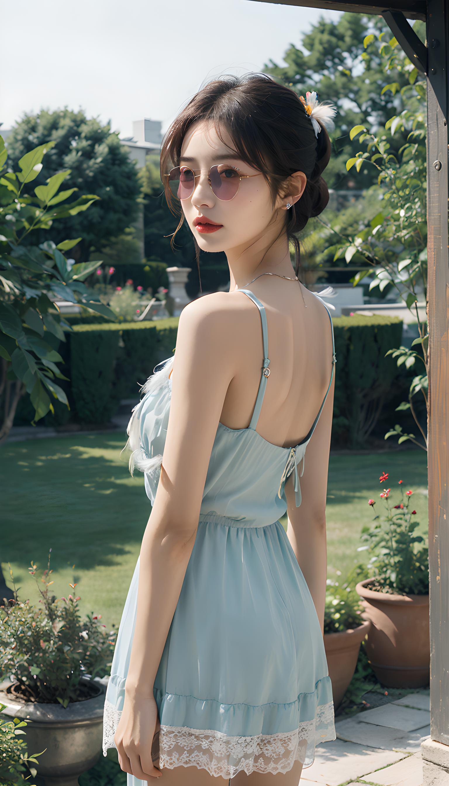 大师作品,最好画质,细节处理,不良少女,彩色睫毛,低双马尾,太阳镜,半身像,(波西米亚风格雪纺长裙:1.5),(羽毛发饰:1.4),(花园派对背景:1.4)