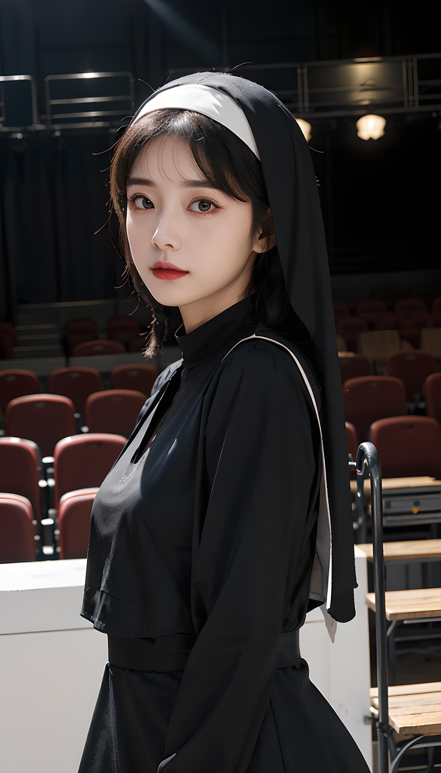 大师作品最好画质令人惊叹精细细节极度美丽的女孩闪闪发光的眼睛双辫子太阳镜舞台角度,(修女服装黑色习惯白领戏剧表演:1.5