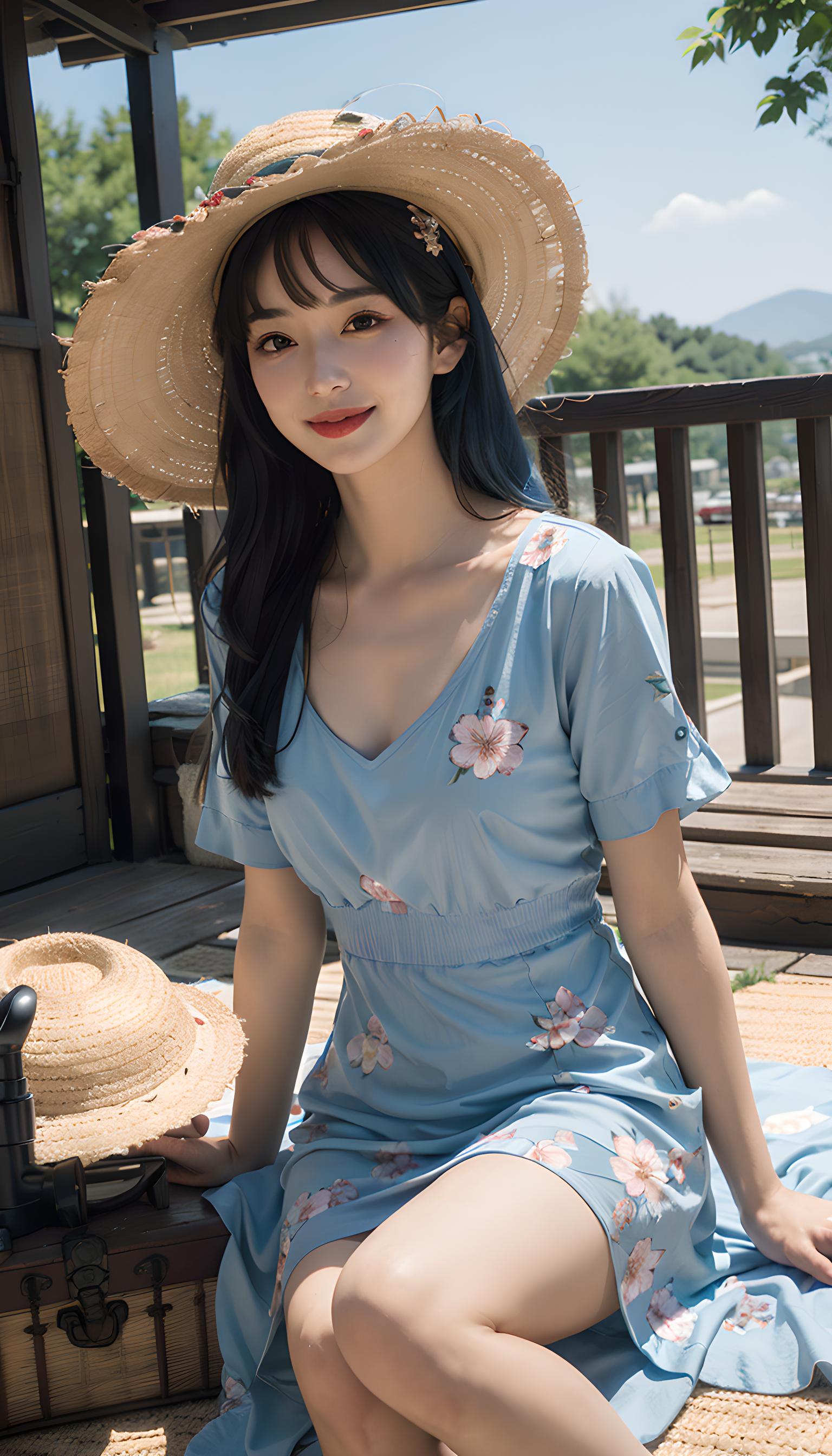 大师作品HDR, UHD, 8K女性微笑蓝发洛丽塔发饰第一人称视角,(花卉夏季连衣裙:1.5),(草帽:1.3),(野餐公园背景:1.2
