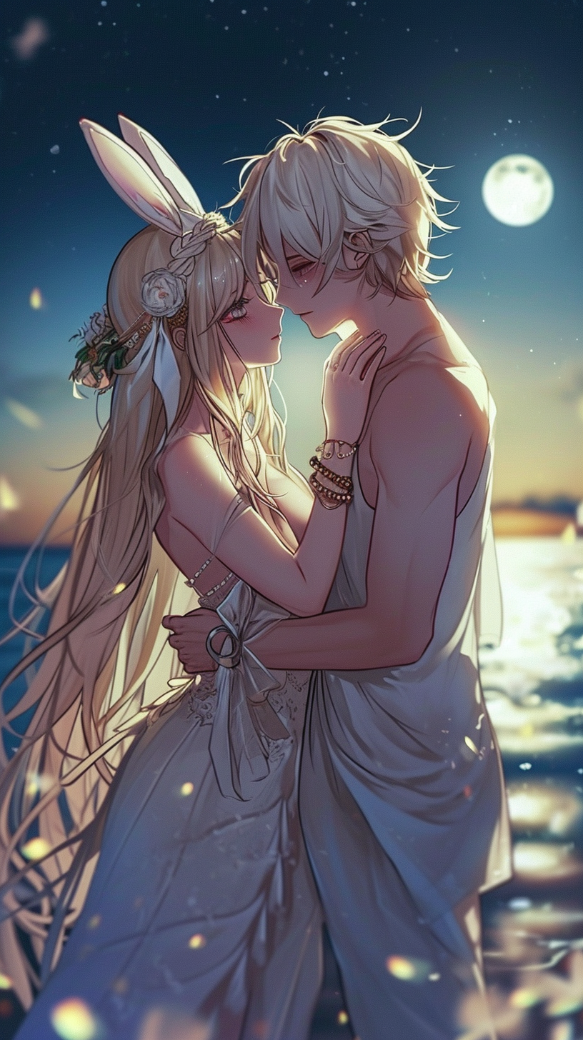 女孩,单人,半闭眼睛,长睫毛,美瞳,闭嘴,兔子耳朵,微笑,长发,头发过肩,金发,眉间刘海,天线呆毛,手链,婚纱,十指相扣,手放嘴边,屈膝抱腿坐,亲吻另一个男孩的脸颊,海滩,春天,夜晚