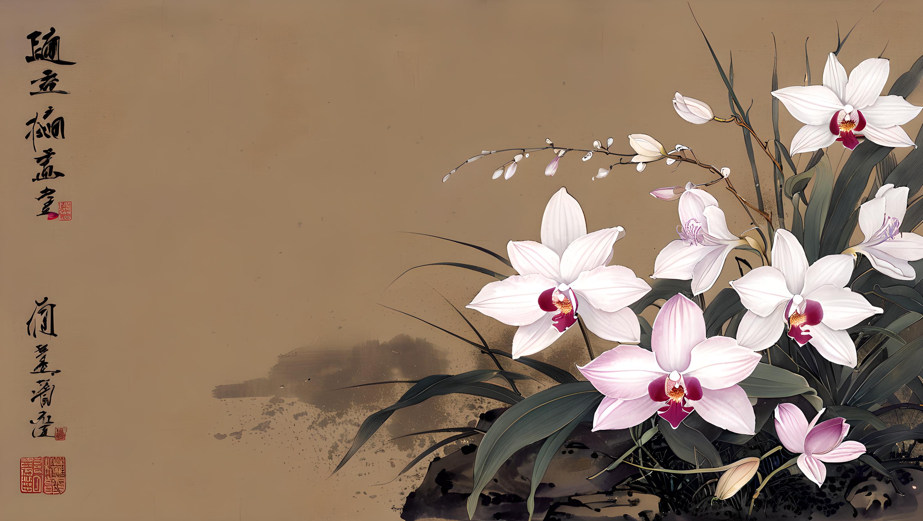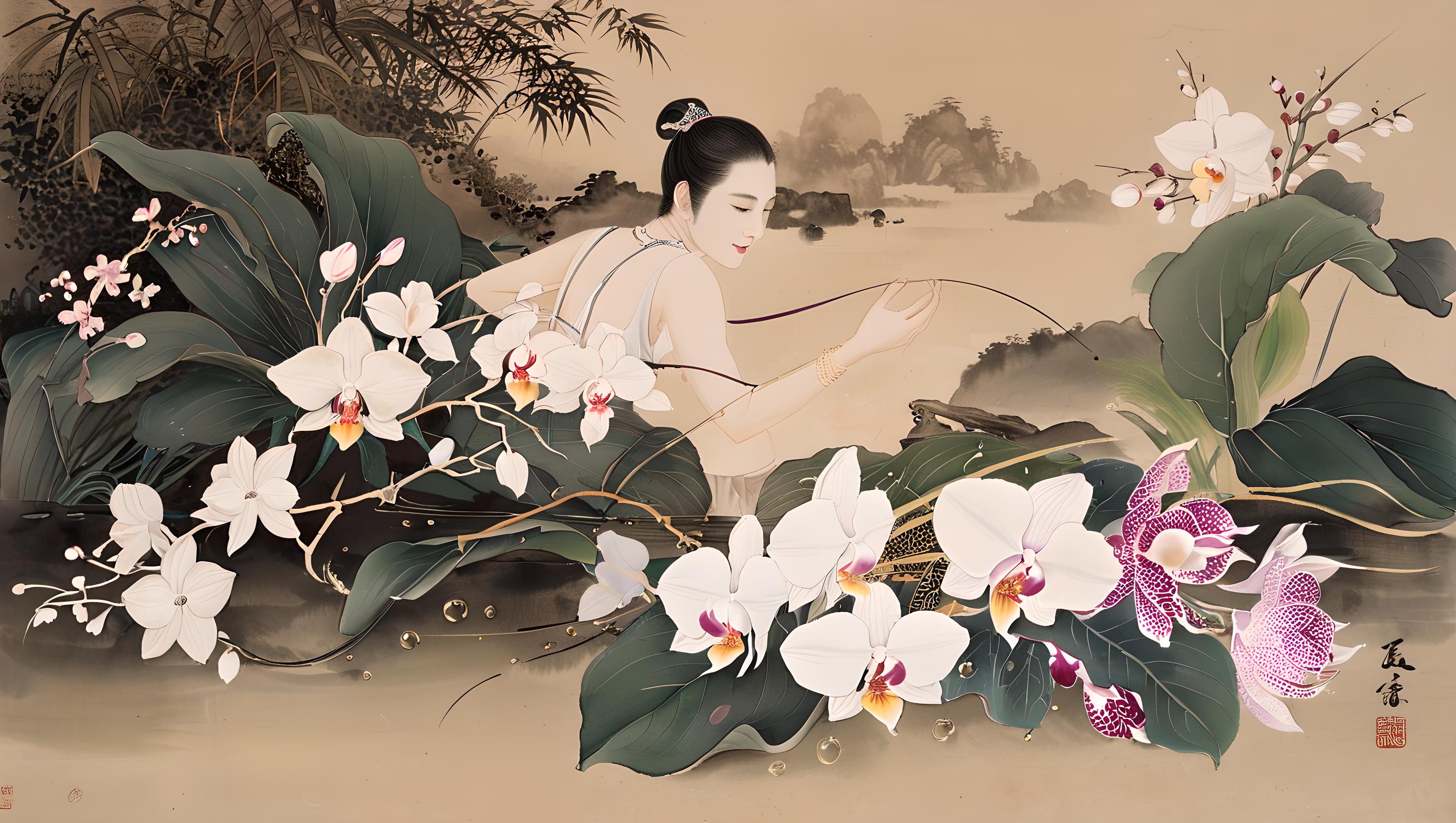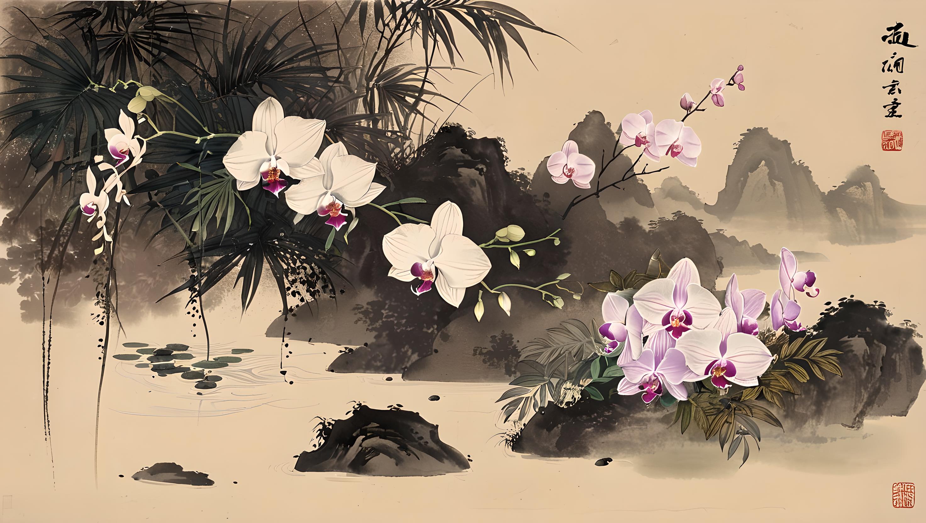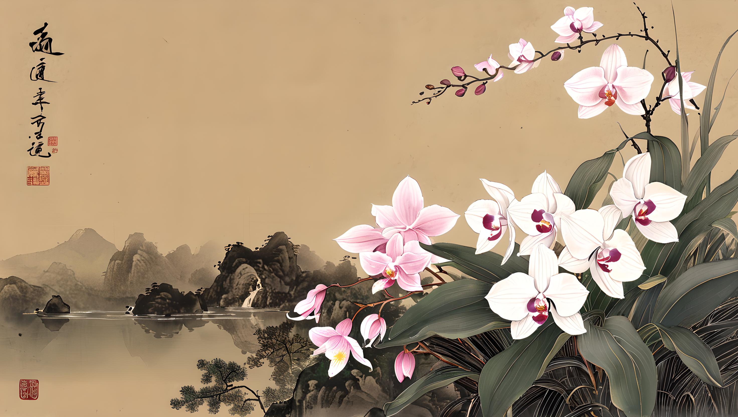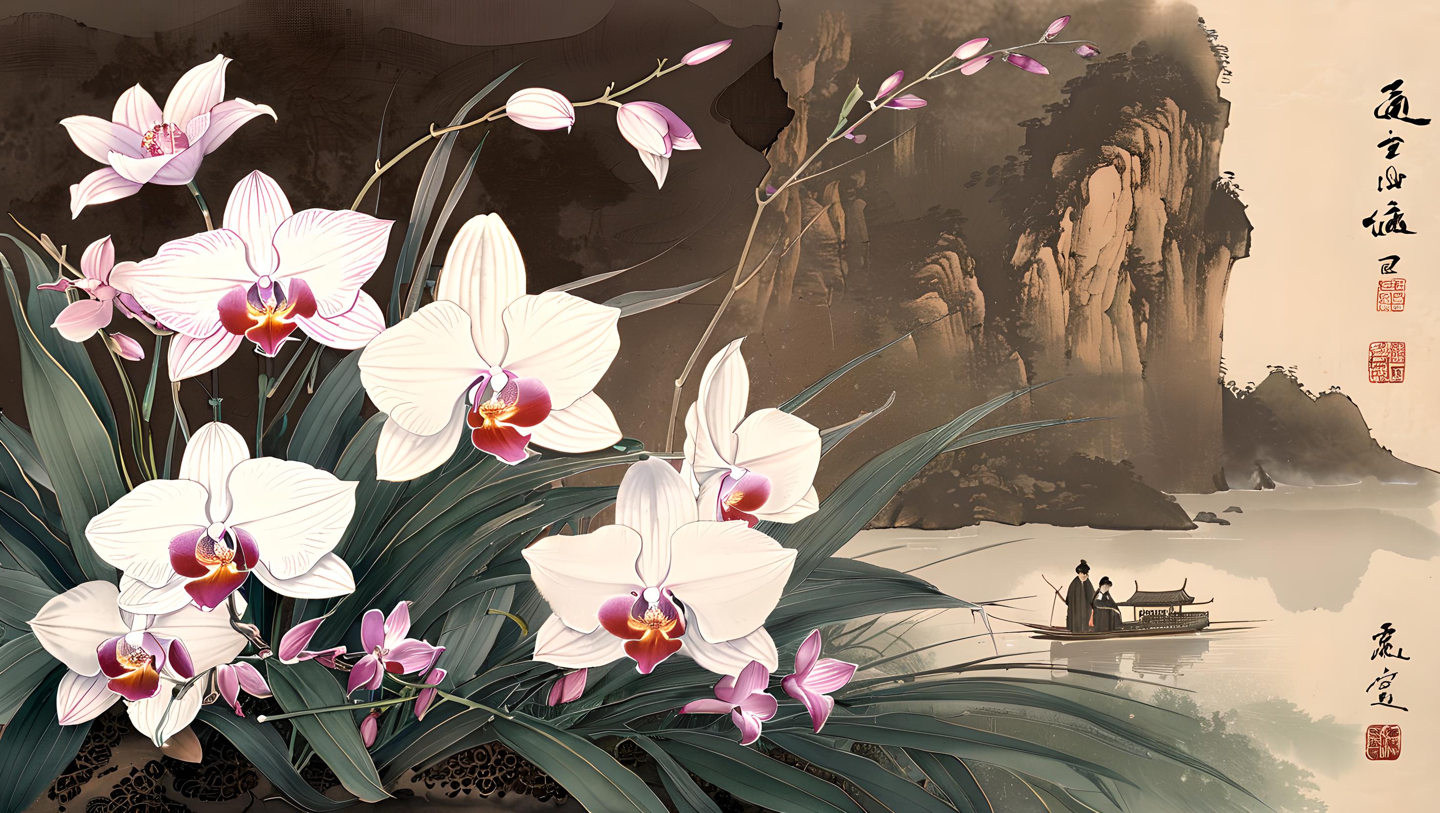 兰花的花朵形态多样,有单瓣、复瓣之分,颜色丰富,包括白、黄、绿、紫、红等多种色彩,以及复色和斑纹品种,各具风姿。花瓣薄而透明,质地细腻,排列整齐,有的品种花瓣边缘还微微卷曲,显得尤为精致。花心中常有雄蕊和雌蕊,雄蕊数目众多,花丝细长,花药饱满;雌蕊则位于花朵中央,柱头明显。具有中国画的风格、它细节精致,色彩优雅,捕捉自然光线、背景是一幅水墨山水画、加题词、印章、8K、高分辨率。