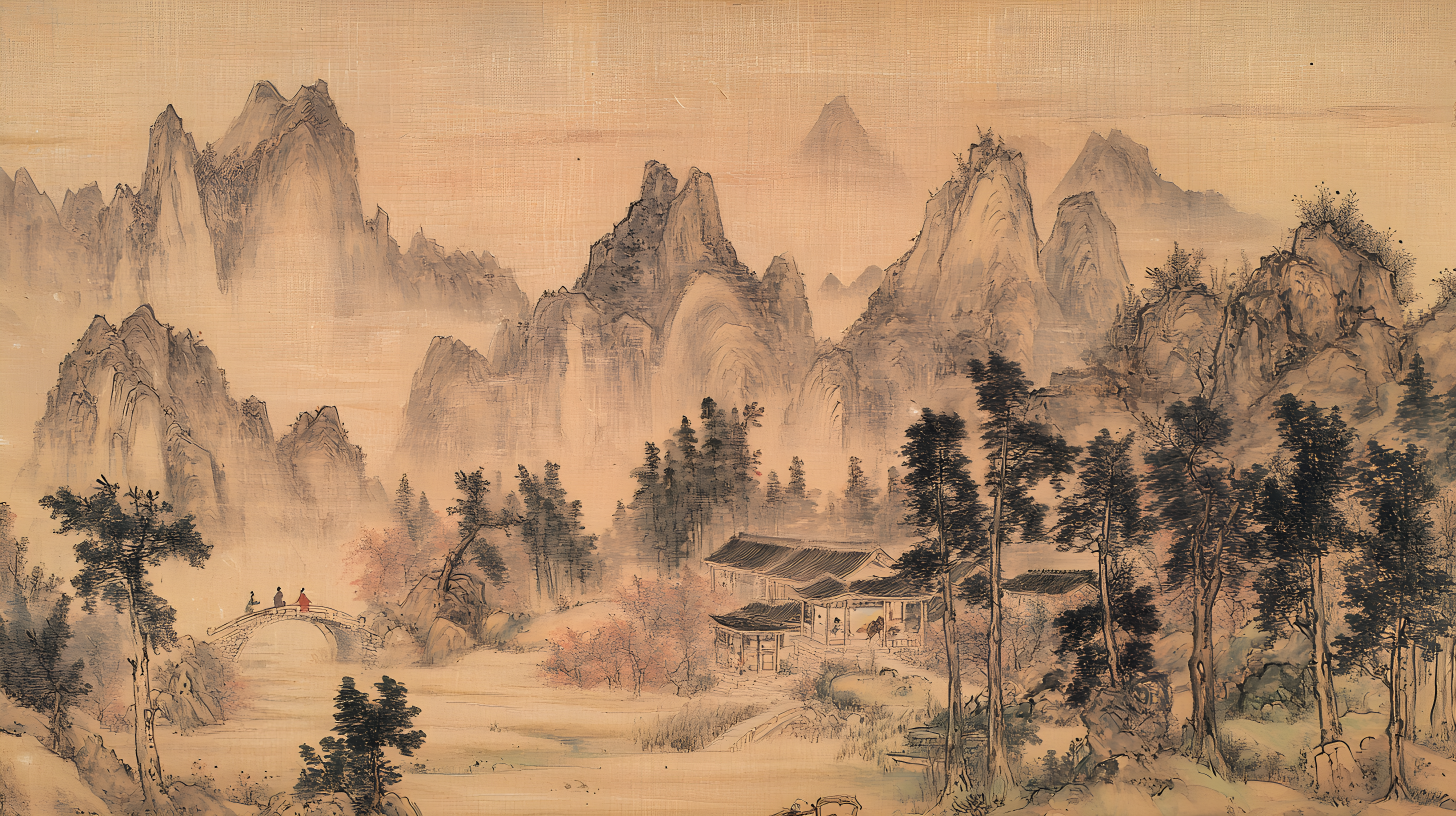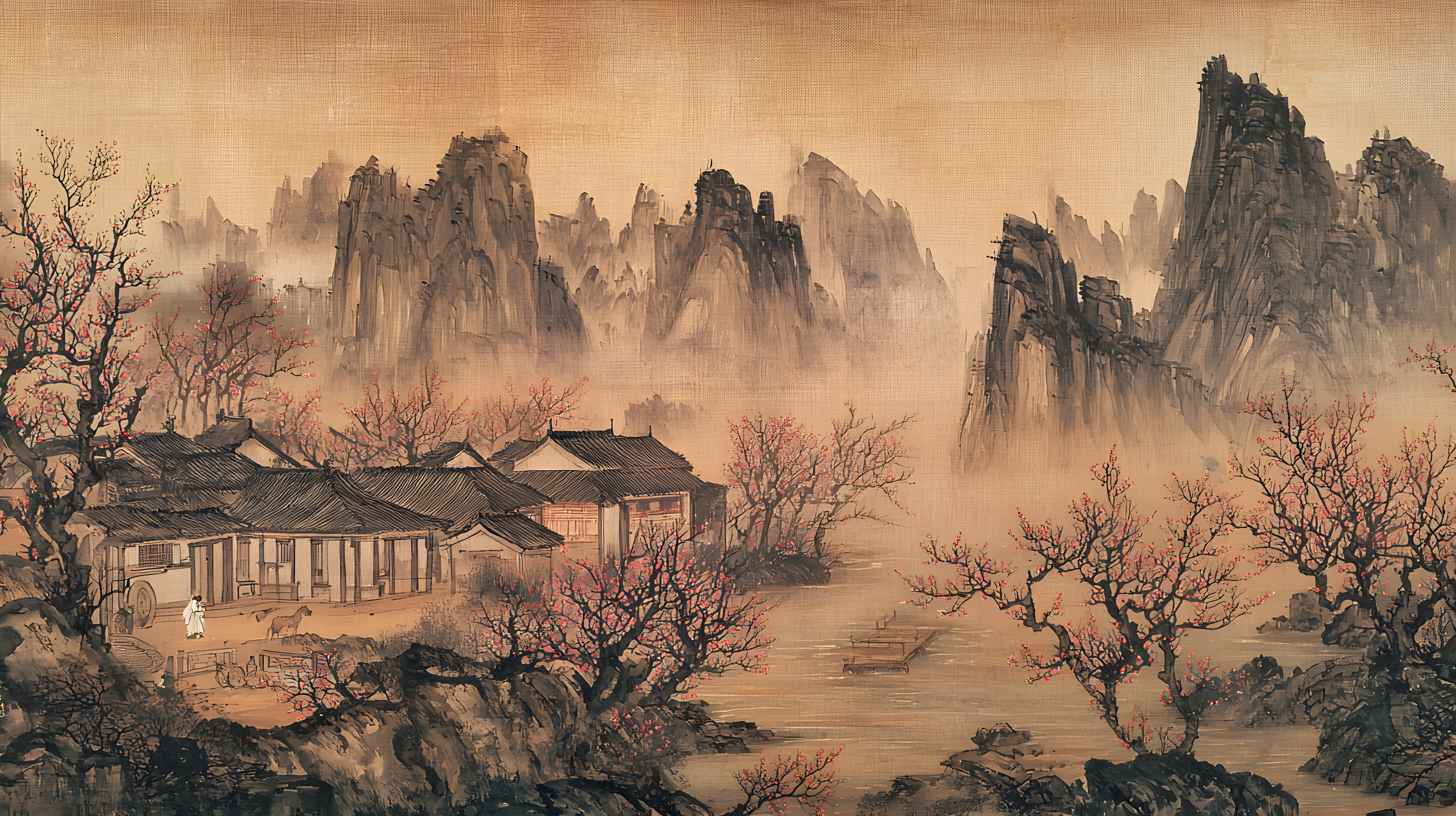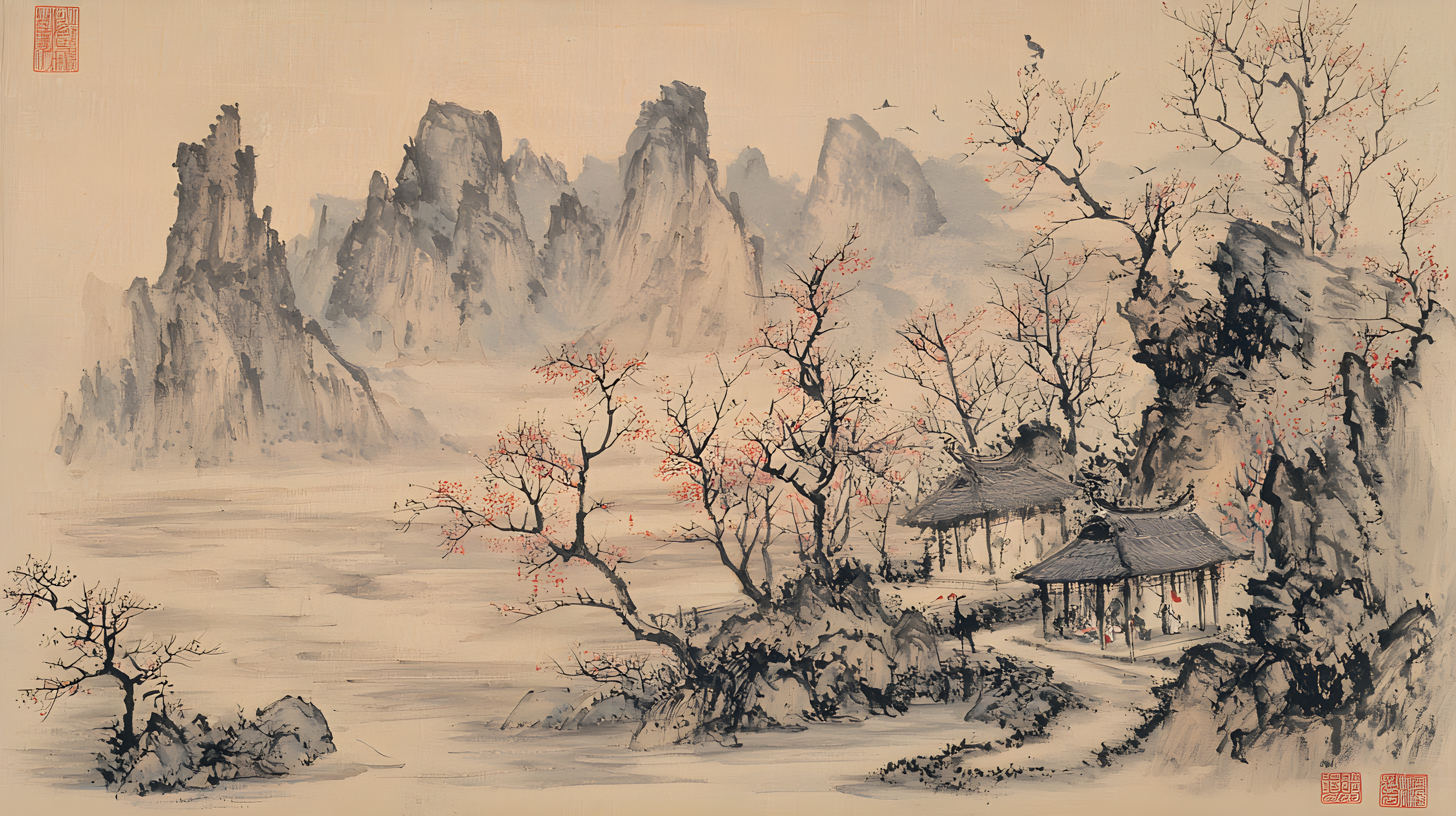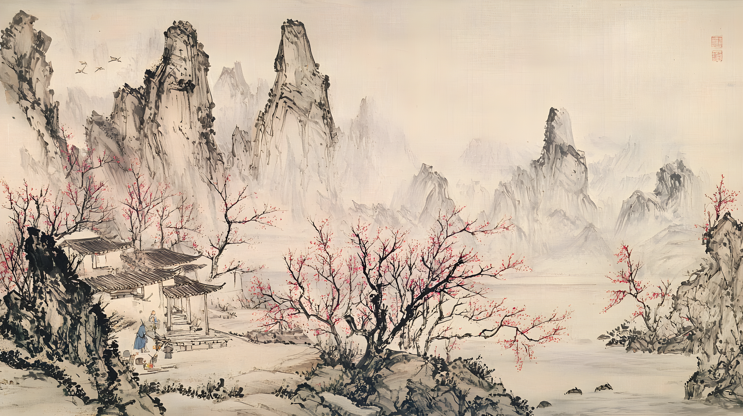 唐寅绘画风格画面布局严谨整饬造型真实生动山势雄峻石质坚峭皴法斧劈笔法劲健墨色淋漓充分展现了作者山水画的独特风格 早春的山林中红梅花开 远景与近景相互呼应形成层次分明的视觉效果 远景中陡峭的山峰如泰山压顶画面中峻峭的山峰、盘曲的山道、急湍的危桥以及葱郁的林木构成了一幅生动的自然景观山势雄峻石质坚峭皴法斧劈笔法劲健墨色淋漓画中以水墨提炼形象墨韵明净、生趣盎然云山峭立悬崖高耸琼阁隐现 中景画水面上波光粼粼一名渔父正摇橹靠岸江岸上是一片疏朗的杂树林几间简陋的茅舍掩映在丹枫之间一间稍大的茅屋里两名老者正席地而坐促膝交谈稍小的茅屋内一名童子正在侍弄茶灶为主人烹煮新茶 近景中红梅花开、文人逸士与家仆骑马郊游在松林间策马扬鞭结伴郊游的场景茅屋里穿插有序松树下有两个文士策马而行结伴到郊外游玩一边挥鞭纵马一边高声吟诗追逐山林间的走兽疲惫时就在树下小憩把盏饮酒谈经论道笑着招呼林间的飞鸟前来同饮