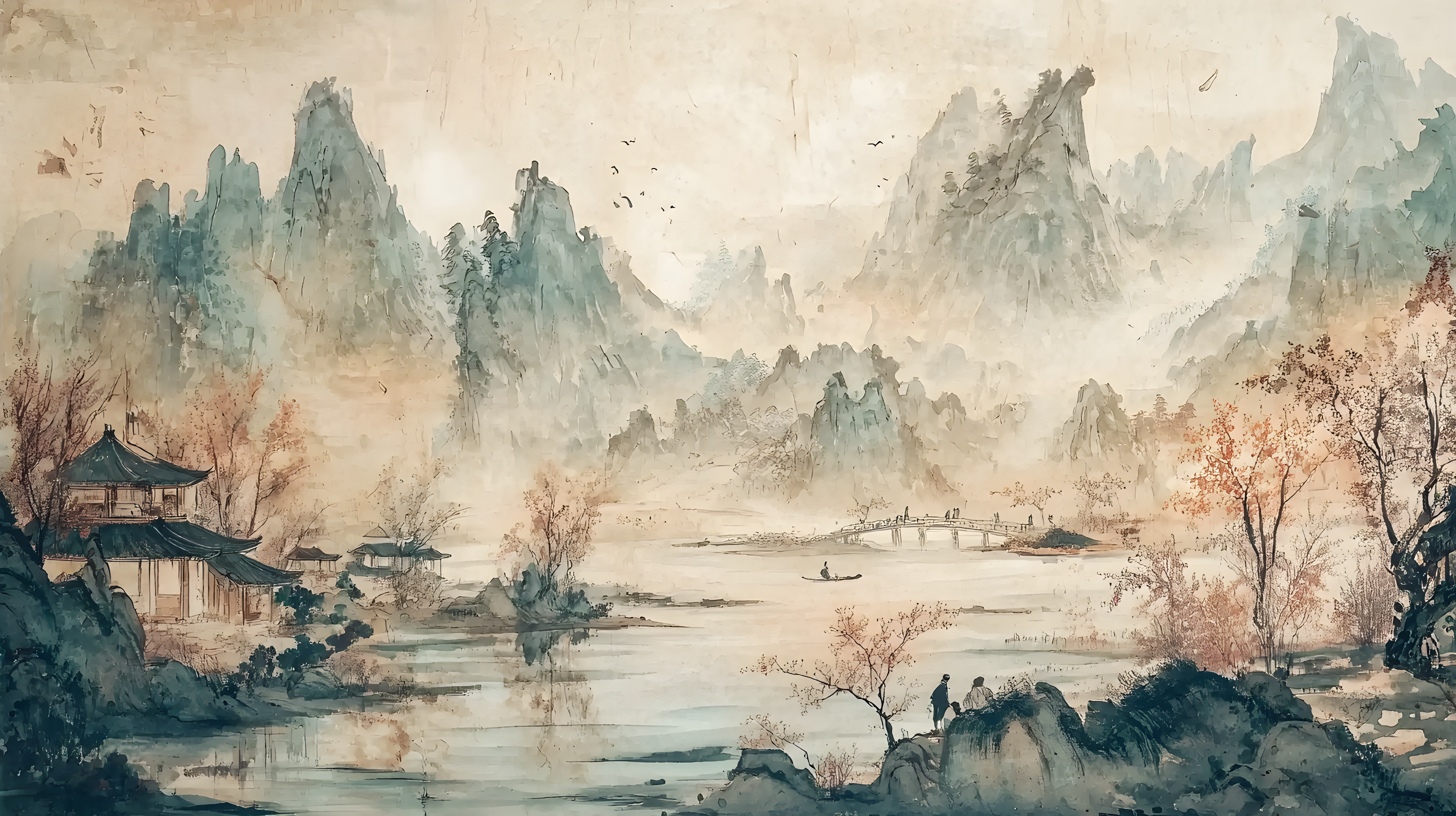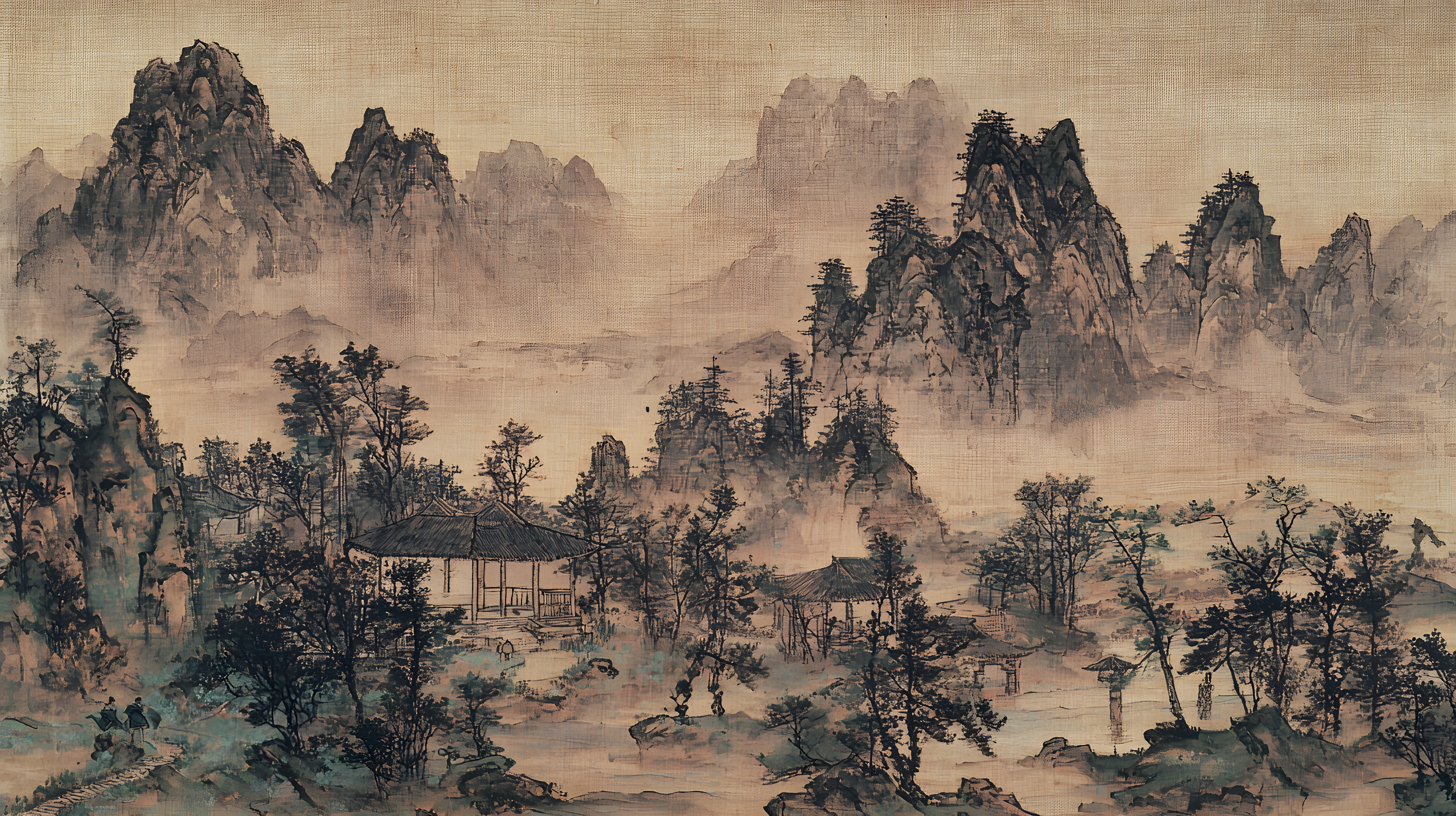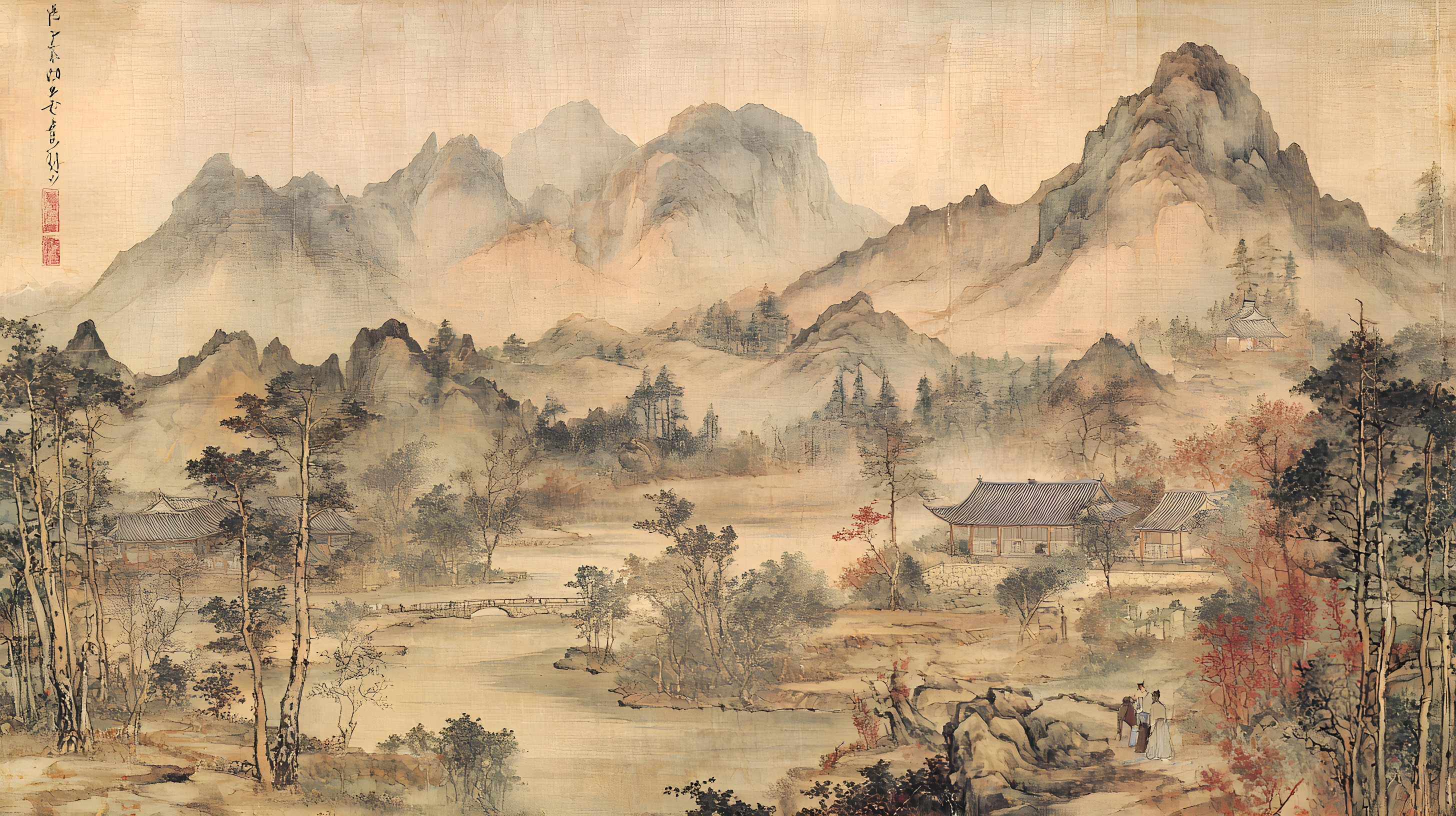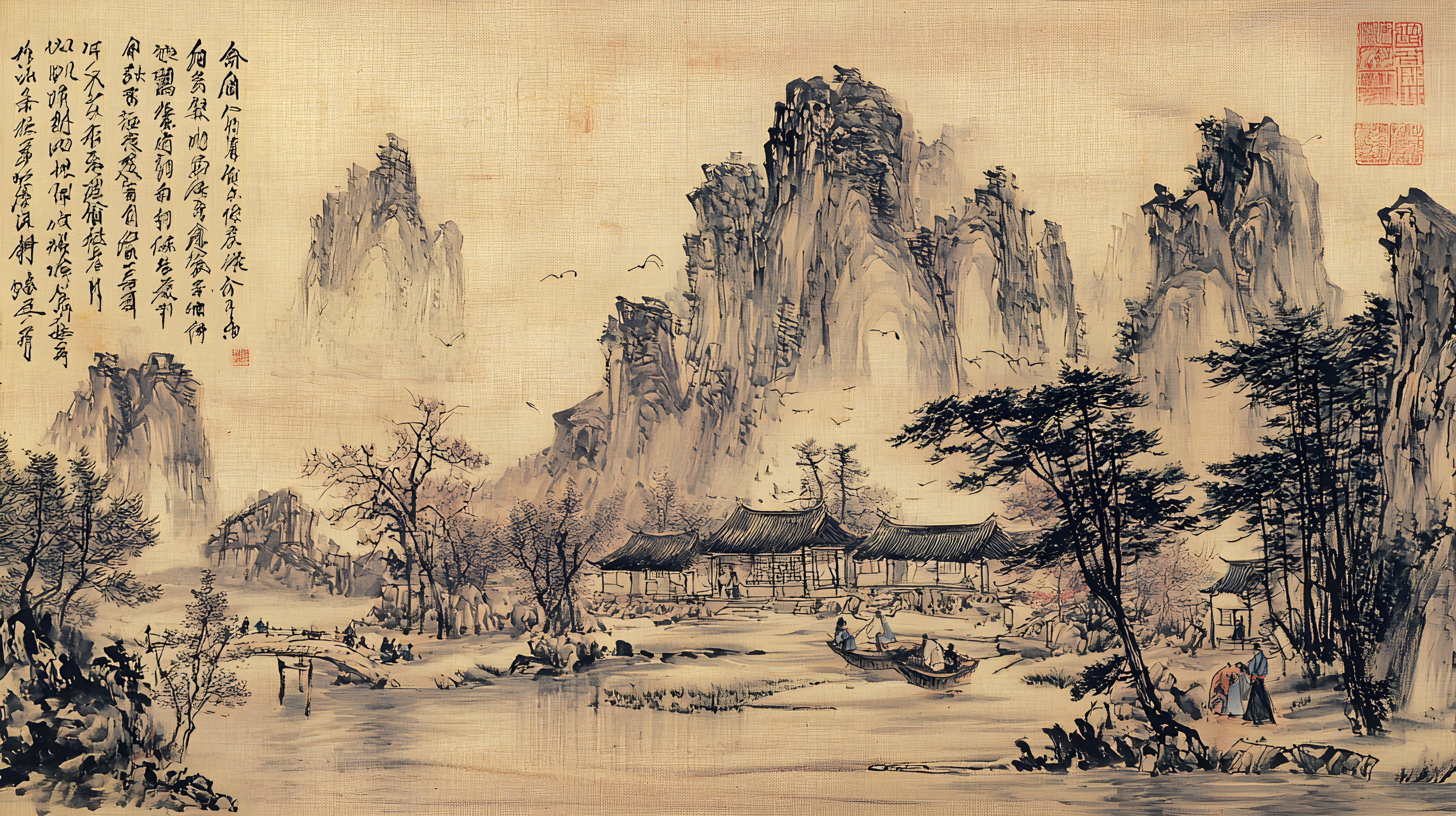 唐寅绘画风格画面布局严谨整饬造型真实生动山势雄峻石质坚峭皴法斧劈笔法劲健墨色淋漓充分展现了作者山水画的独特风格 早春的山林中红梅花开 远景与近景相互呼应形成层次分明的视觉效果 远景中陡峭的山峰如泰山压顶画面中峻峭的山峰、盘曲的山道、急湍的危桥以及葱郁的林木构成了一幅生动的自然景观山势雄峻石质坚峭皴法斧劈笔法劲健墨色淋漓画中以水墨提炼形象墨韵明净、生趣盎然云山峭立悬崖高耸琼阁隐现 中景画水面上波光粼粼一名渔父正摇橹靠岸江岸上是一片疏朗的杂树林几间简陋的茅舍掩映在丹枫之间一间稍大的茅屋里两名老者正席地而坐促膝交谈稍小的茅屋内一名童子正在侍弄茶灶为主人烹煮新茶 近景中红梅花开、文人逸士与家仆骑马郊游在松林间策马扬鞭结伴郊游的场景茅屋里穿插有序松树下有两个文士策马而行结伴到郊外游玩一边挥鞭纵马一边高声吟诗追逐山林间的走兽疲惫时就在树下小憩把盏饮酒谈经论道笑着招呼林间的飞鸟前来同饮
