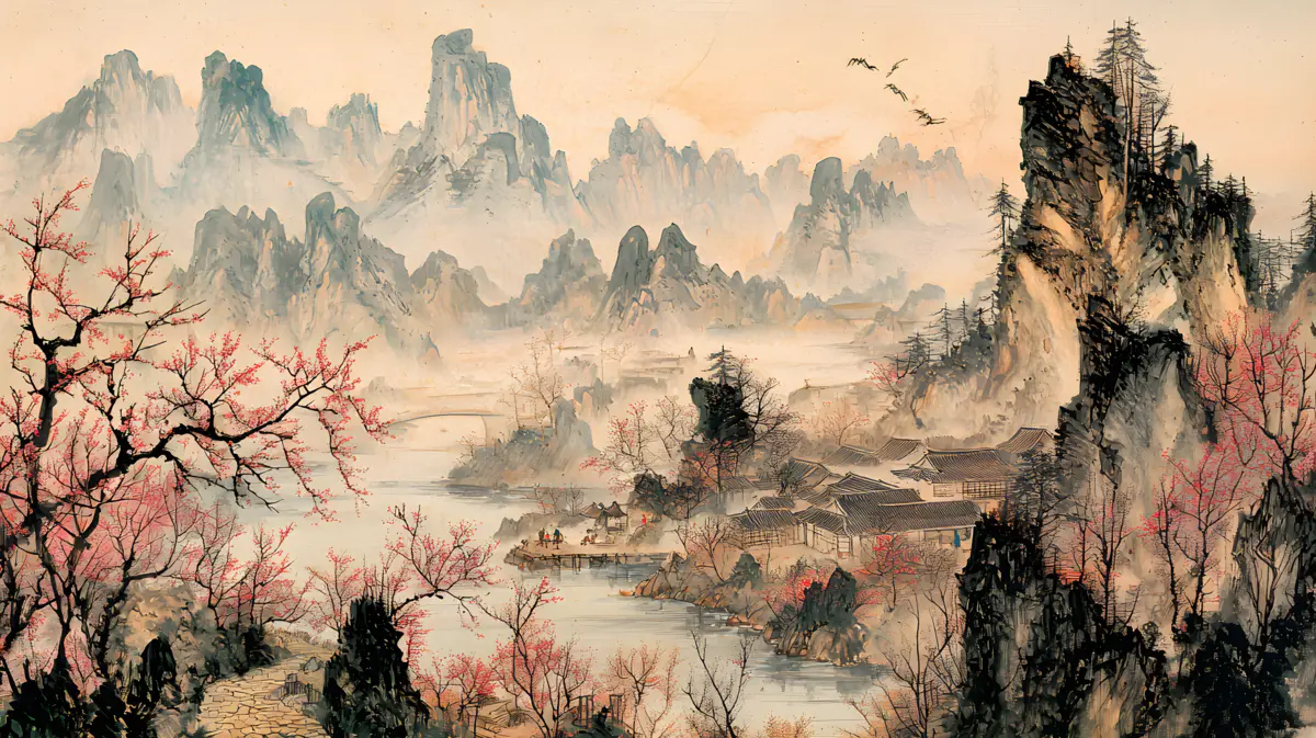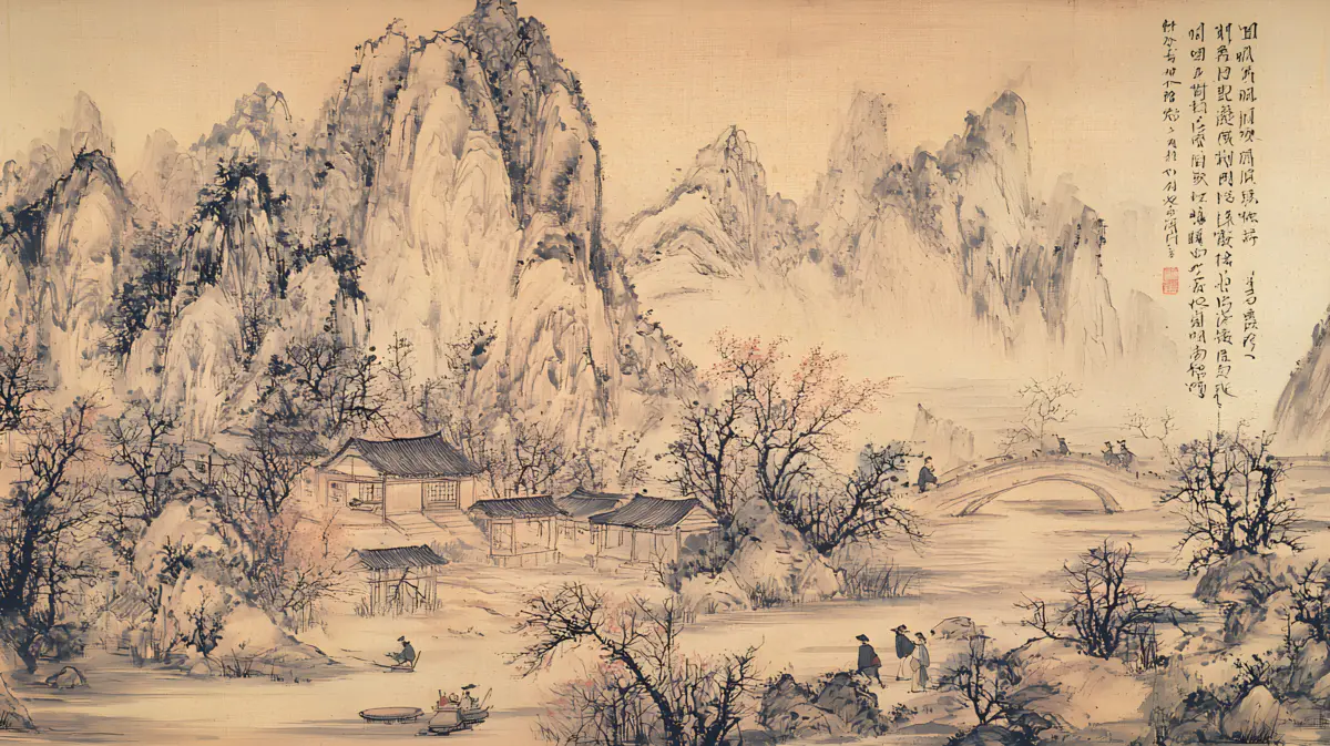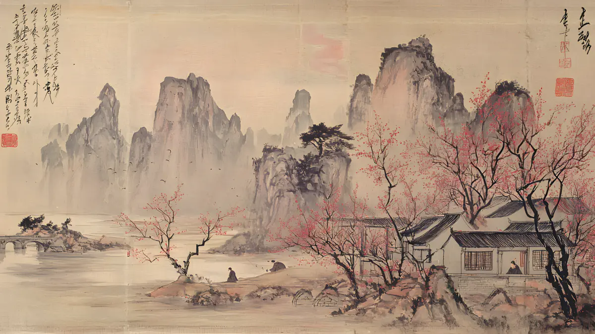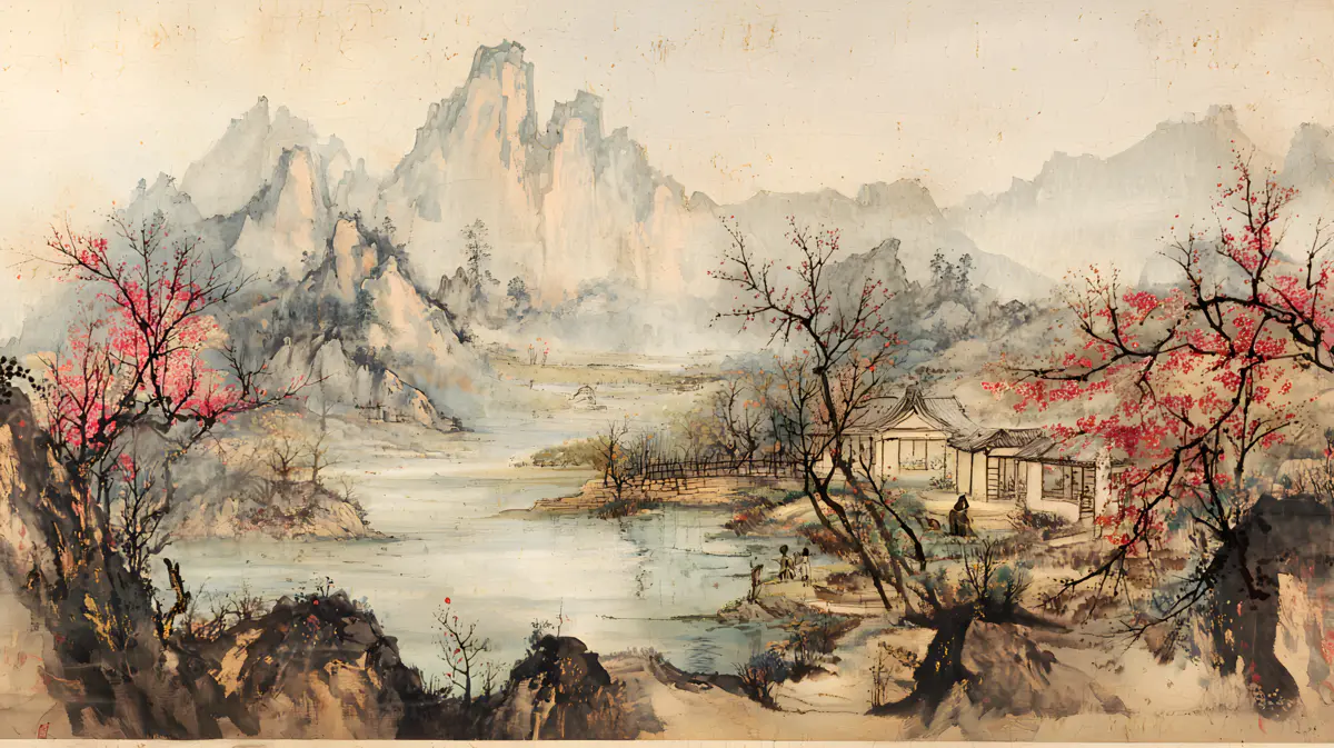 唐寅绘画风格画面布局严谨整饬造型真实生动山势雄峻石质坚峭皴法斧劈笔法劲健墨色淋漓充分展现了作者山水画的独特风格 早春的山林中红梅花开 远景与近景相互呼应形成层次分明的视觉效果 远景中陡峭的山峰如泰山压顶画面中峻峭的山峰、盘曲的山道、急湍的危桥以及葱郁的林木构成了一幅生动的自然景观山势雄峻石质坚峭皴法斧劈笔法劲健墨色淋漓画中以水墨提炼形象墨韵明净、生趣盎然云山峭立悬崖高耸琼阁隐现 中景画水面上波光粼粼一名渔父正摇橹靠岸江岸上是一片疏朗的杂树林几间简陋的茅舍掩映在丹枫之间一间稍大的茅屋里两名老者正席地而坐促膝交谈稍小的茅屋内一名童子正在侍弄茶灶为主人烹煮新茶 近景中红梅花开、文人逸士与家仆骑马郊游在松林间策马扬鞭结伴郊游的场景茅屋里穿插有序松树下有两个文士策马而行结伴到郊外游玩一边挥鞭纵马一边高声吟诗追逐山林间的走兽疲惫时就在树下小憩把盏饮酒谈经论道笑着招呼林间的飞鸟前来同饮
