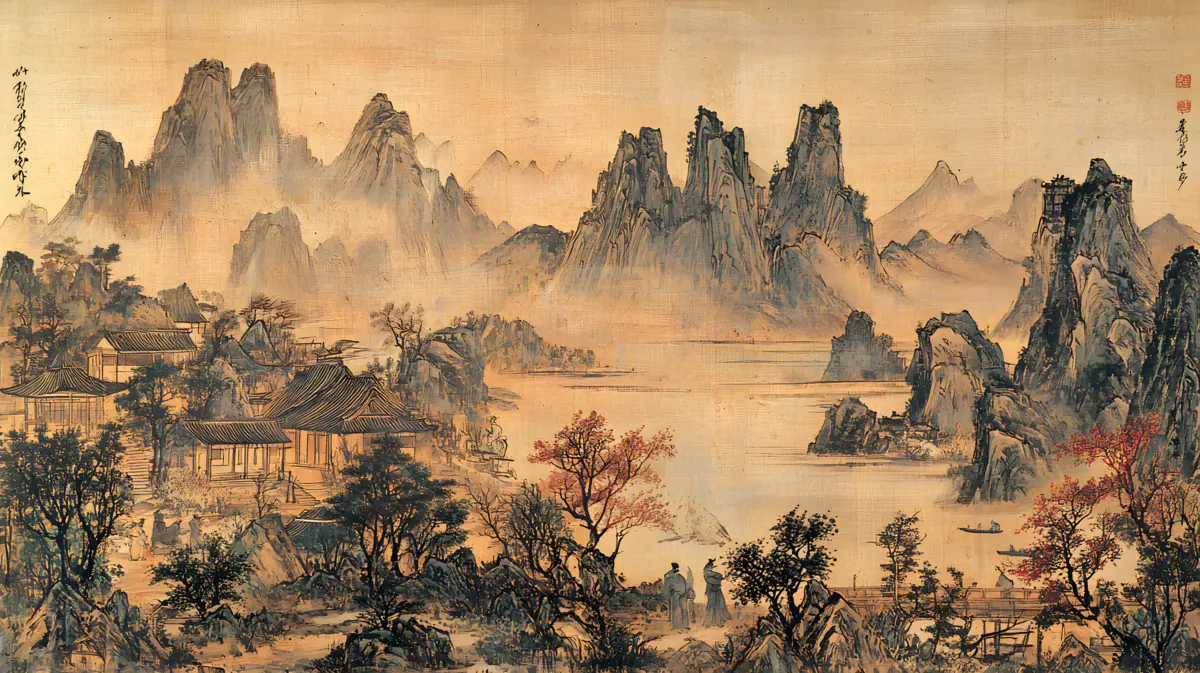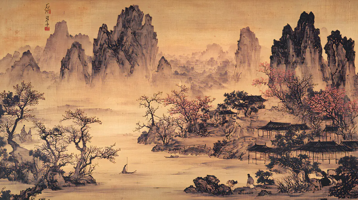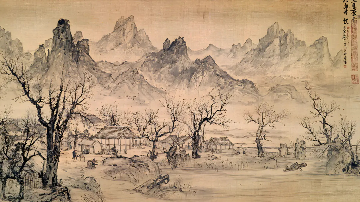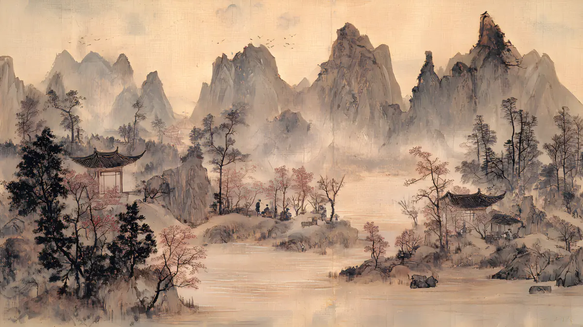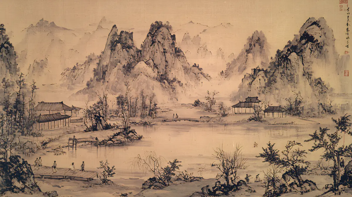 唐寅绘画风格画面布局严谨整饬造型真实生动山势雄峻石质坚峭皴法斧劈笔法劲健墨色淋漓充分展现了作者山水画的独特风格 早春的山林中红梅花开 远景与近景相互呼应形成层次分明的视觉效果 远景中陡峭的山峰如泰山压顶画面中峻峭的山峰、盘曲的山道、急湍的危桥以及葱郁的林木构成了一幅生动的自然景观山势雄峻石质坚峭皴法斧劈笔法劲健墨色淋漓画中以水墨提炼形象墨韵明净、生趣盎然云山峭立悬崖高耸琼阁隐现 中景画水面上波光粼粼一名渔父正摇橹靠岸江岸上是一片疏朗的杂树林几间简陋的茅舍掩映在丹枫之间一间稍大的茅屋里两名老者正席地而坐促膝交谈稍小的茅屋内一名童子正在侍弄茶灶为主人烹煮新茶 近景中红梅花开、文人逸士与家仆骑马郊游在松林间策马扬鞭结伴郊游的场景茅屋里穿插有序松树下有两个文士策马而行结伴到郊外游玩一边挥鞭纵马一边高声吟诗追逐山林间的走兽疲惫时就在树下小憩把盏饮酒谈经论道笑着招呼林间的飞鸟前来同饮