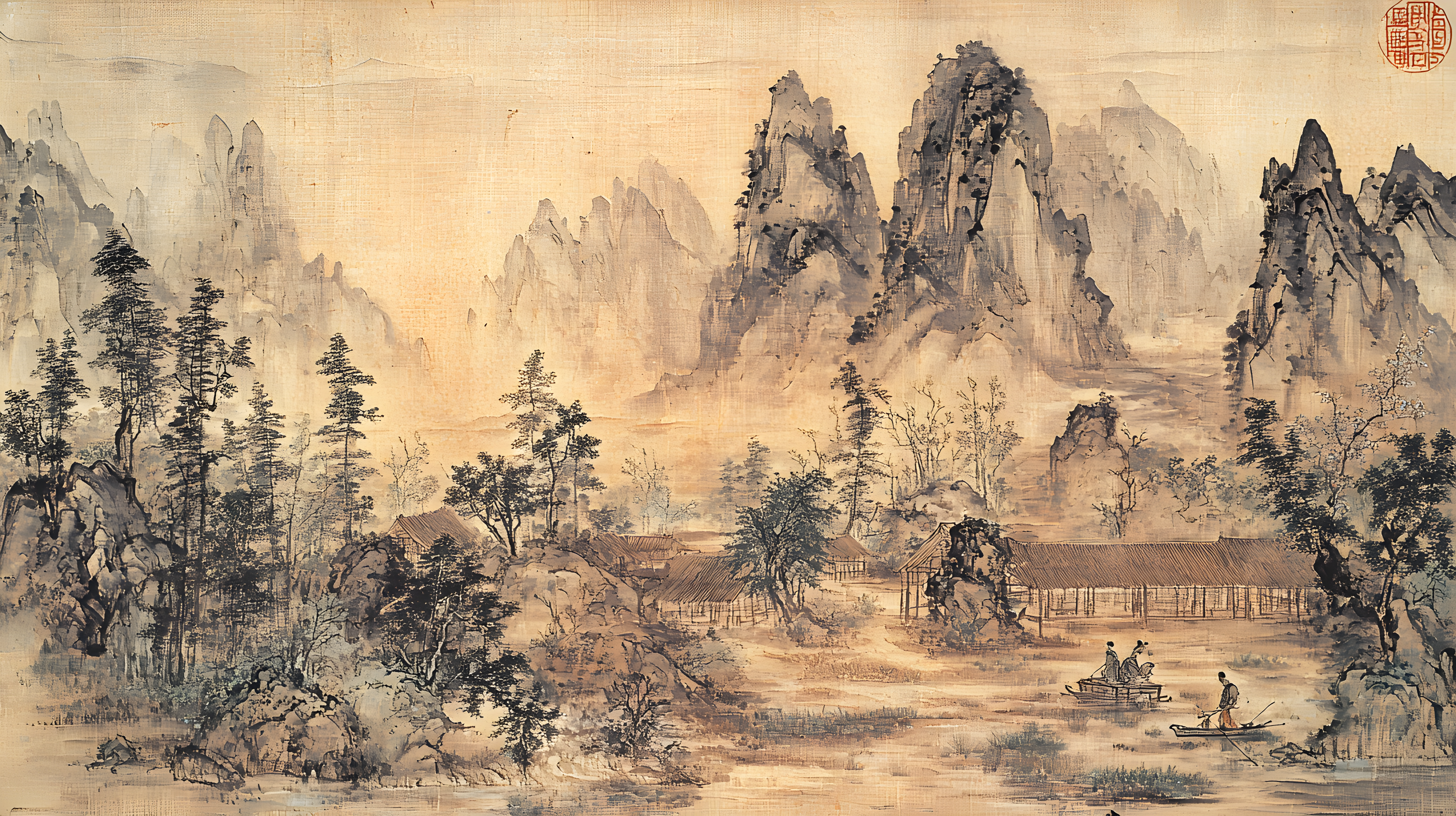 中景画,水面上波光粼粼,一名渔父正摇橹靠岸;江岸上是一片疏朗的杂树林,几间简陋的茅舍掩映在丹枫之间,一间稍大的茅屋里,两名老者正席地而坐,促膝交谈,稍小的茅屋内,一名童子正在侍弄茶灶,为主人烹煮新茶。