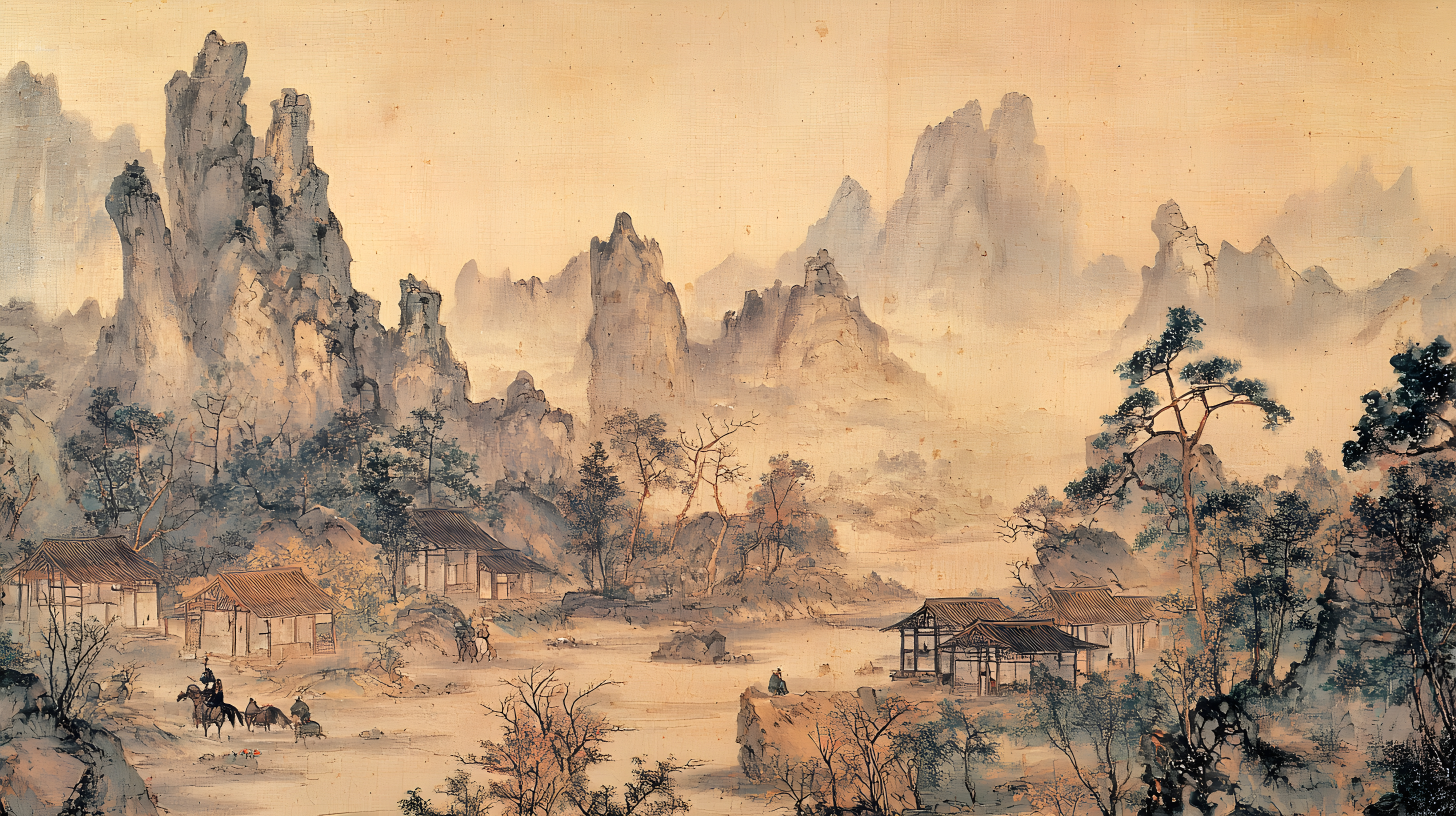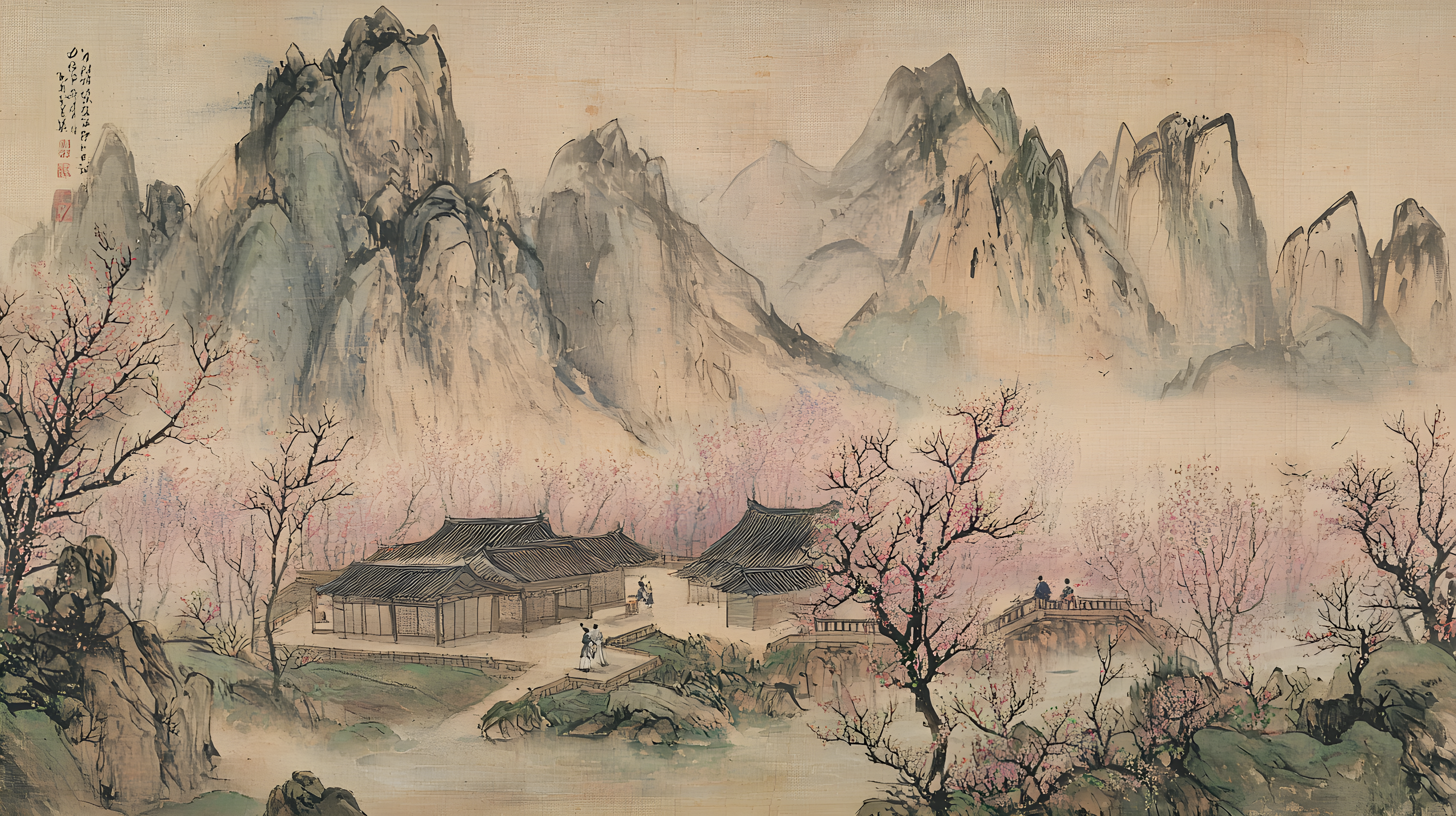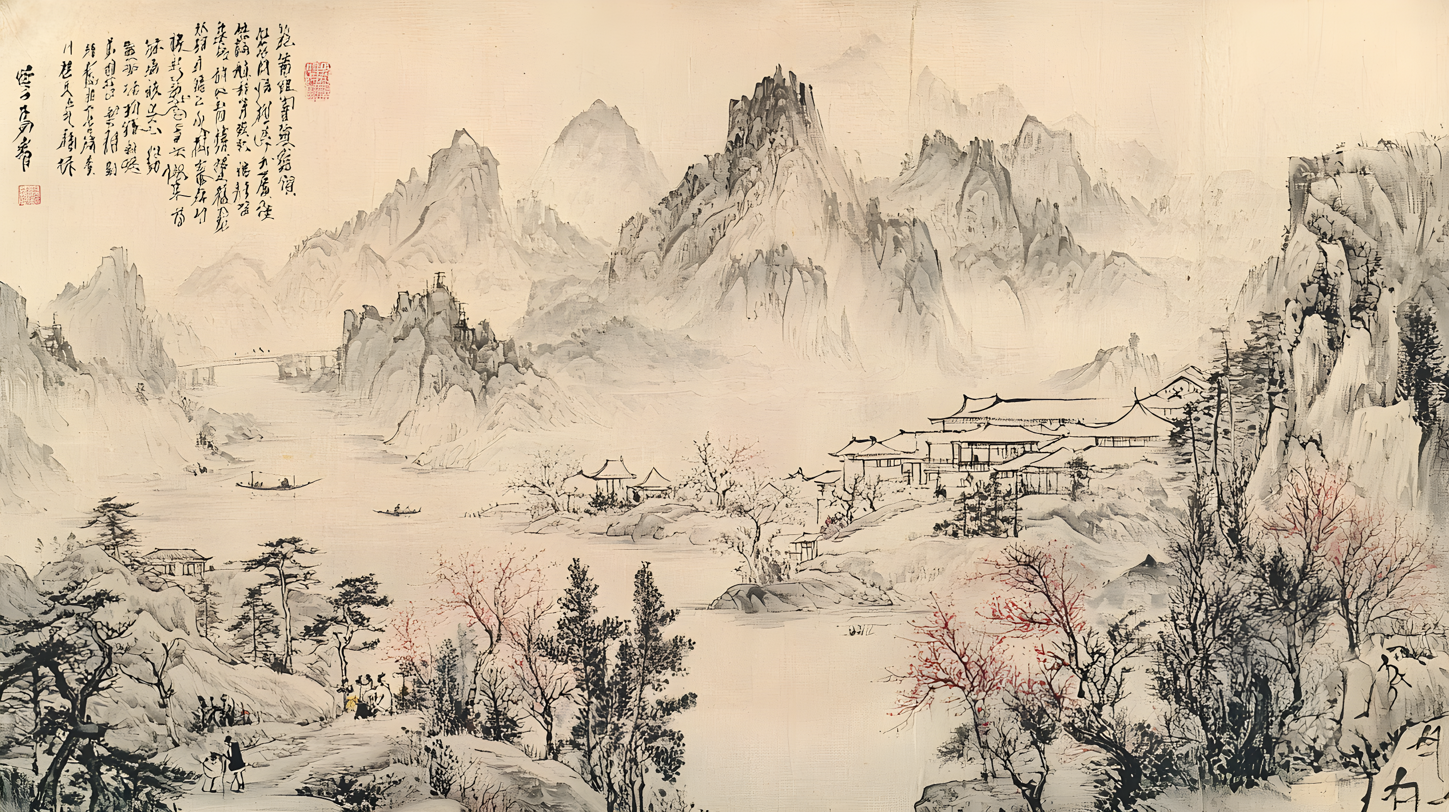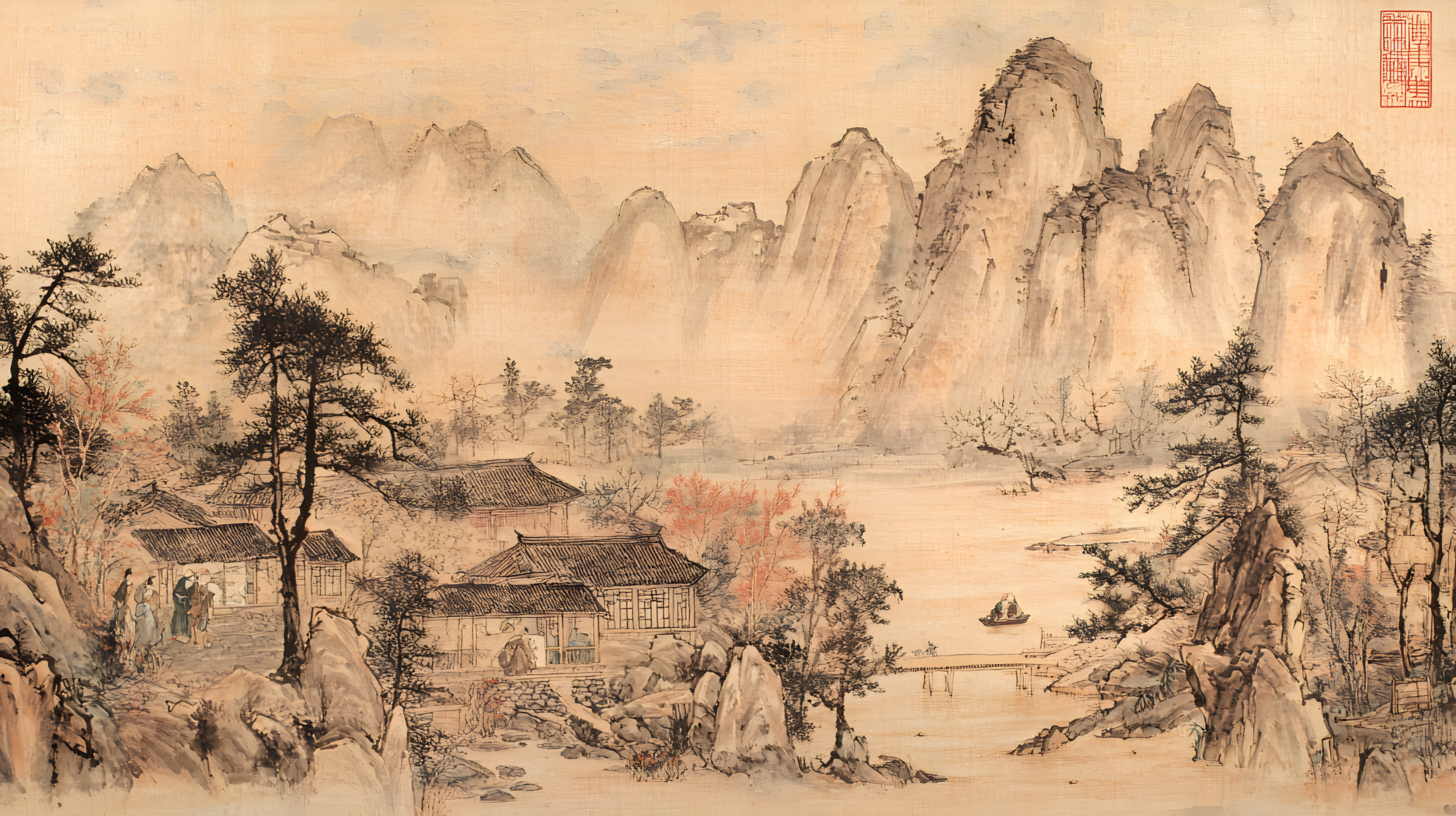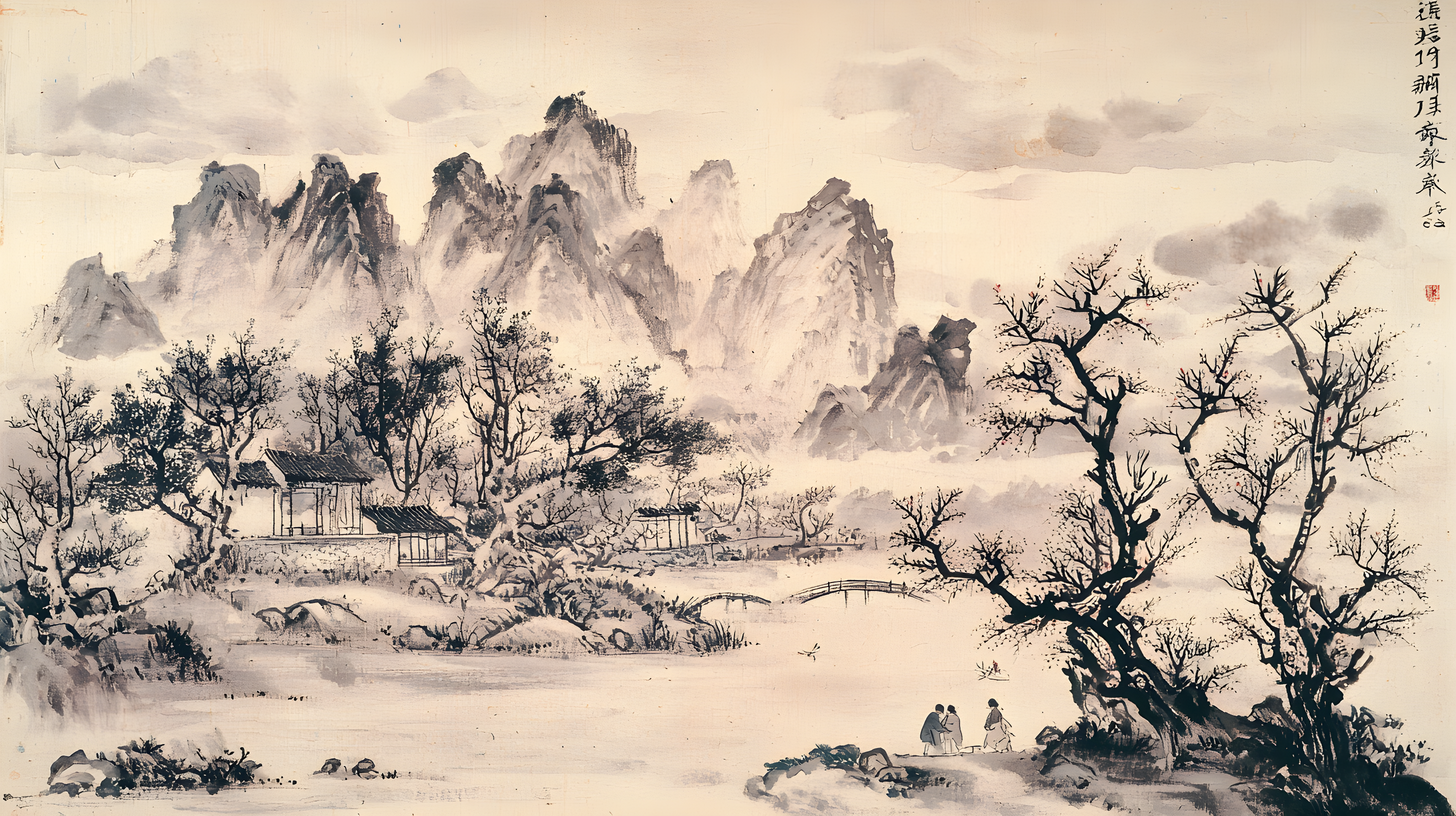 近景中,红梅花开、文人逸士与家仆骑马郊游,在松林间策马扬鞭,结伴郊游的场景,茅屋里穿插有序,松树下有两个文士策马而行,结伴到郊外游玩,一边挥鞭纵马,一边高声吟诗,追逐山林间的走兽;疲惫时就在树下小憩,把盏饮酒,谈经论道,笑着招呼林间的飞鸟前来同饮。