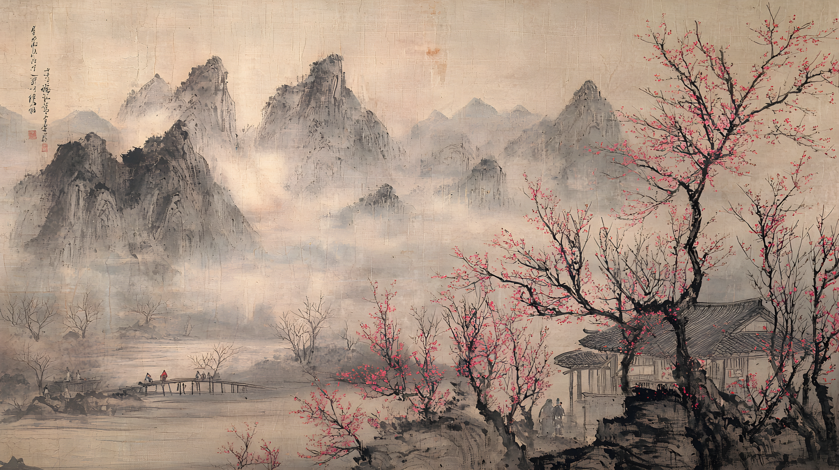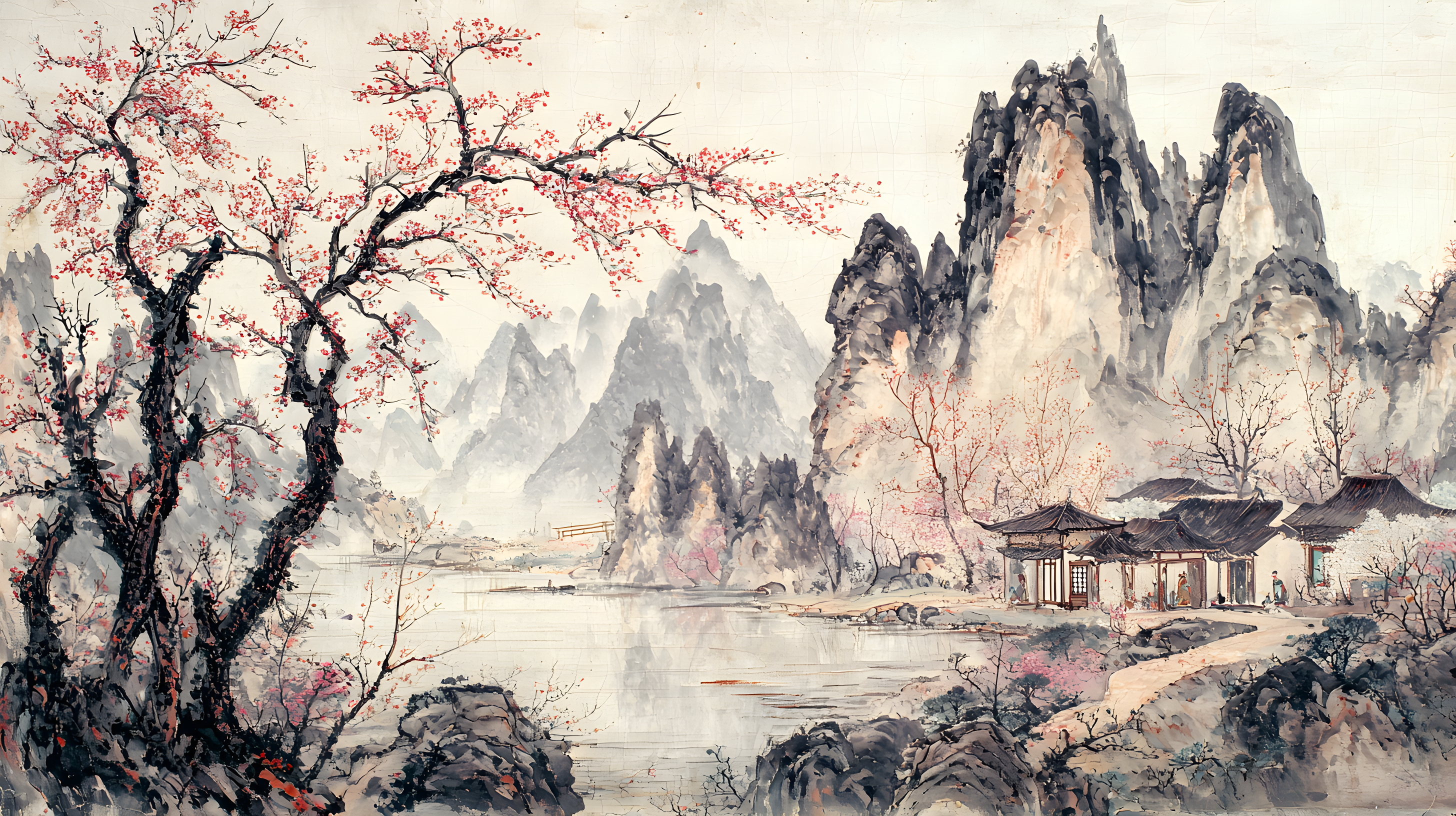 早春的山林中,红梅花开, 远景与近景相互呼应,形成层次分明的视觉效果。