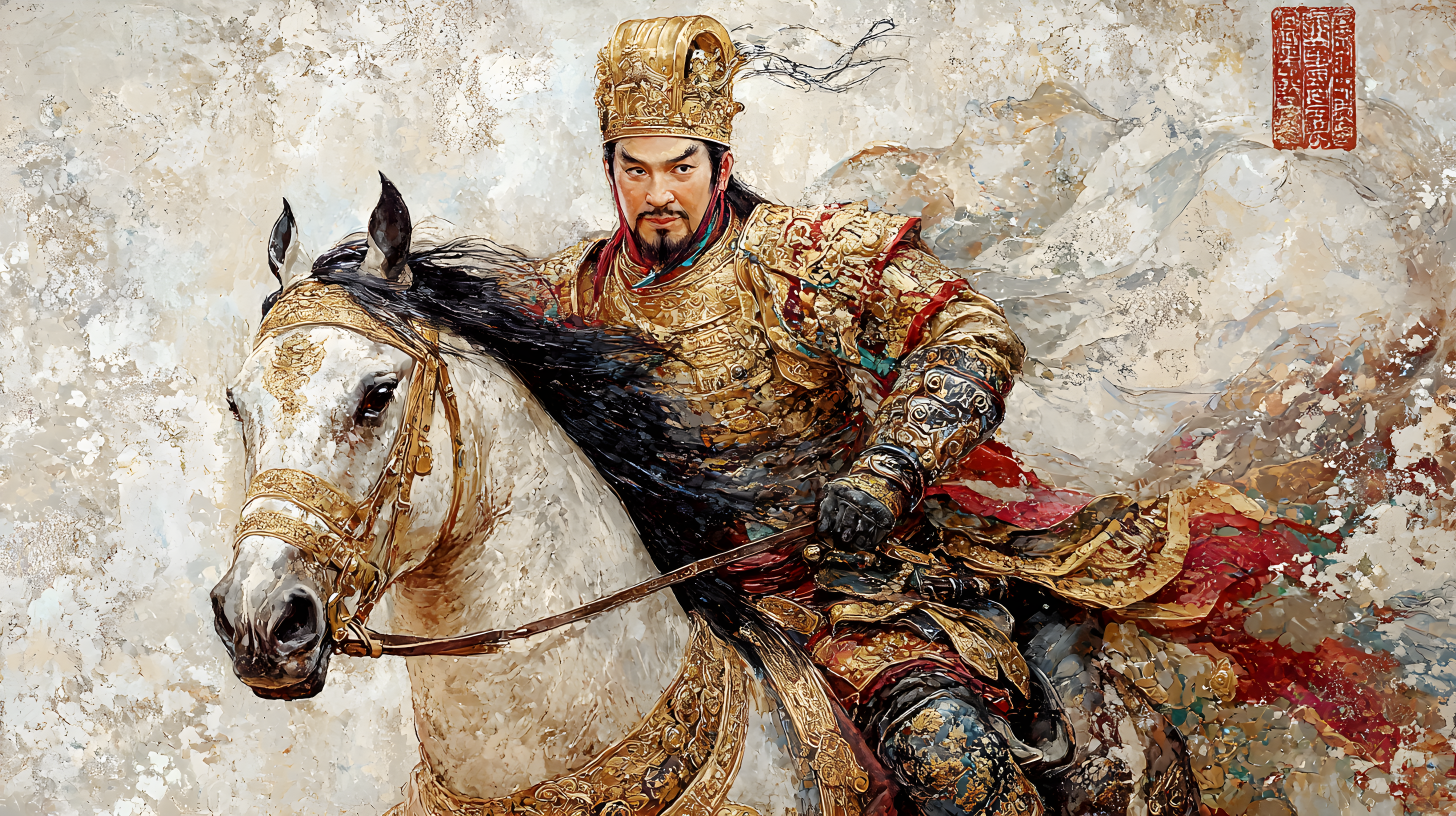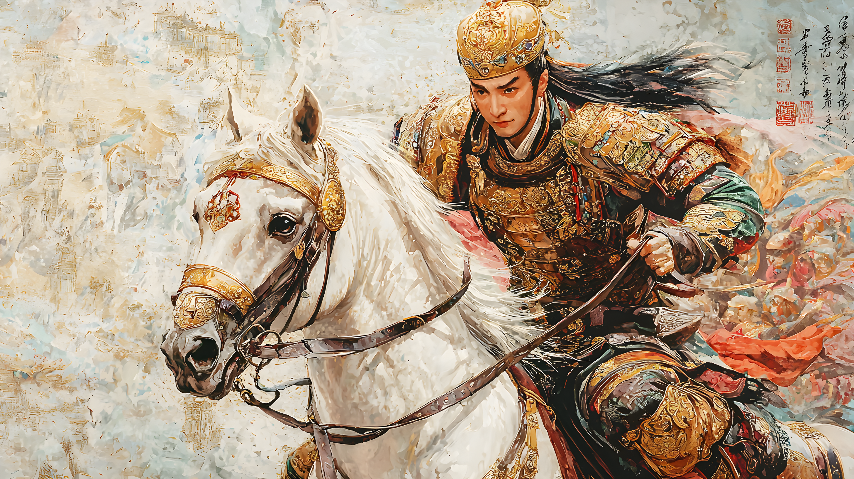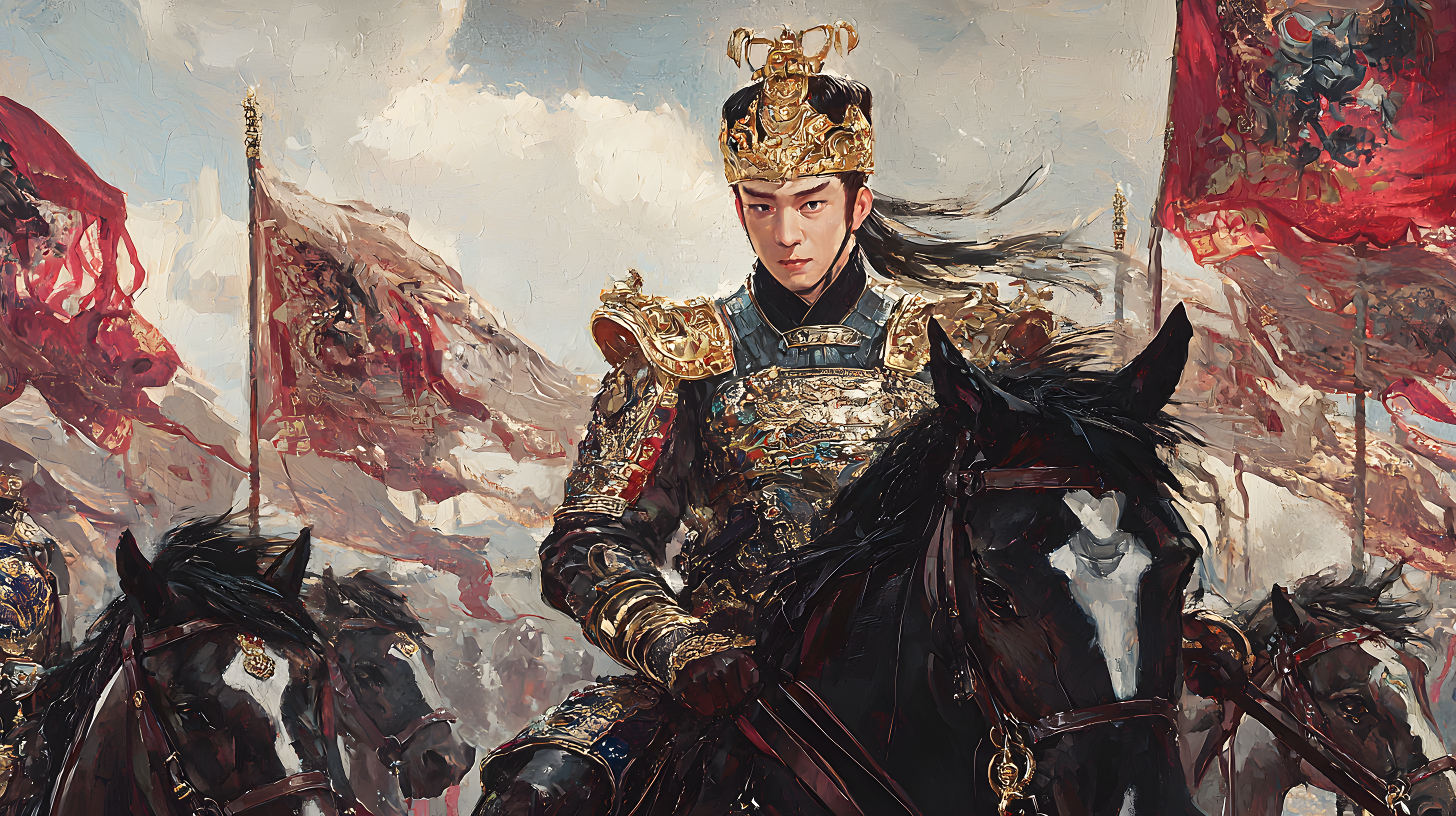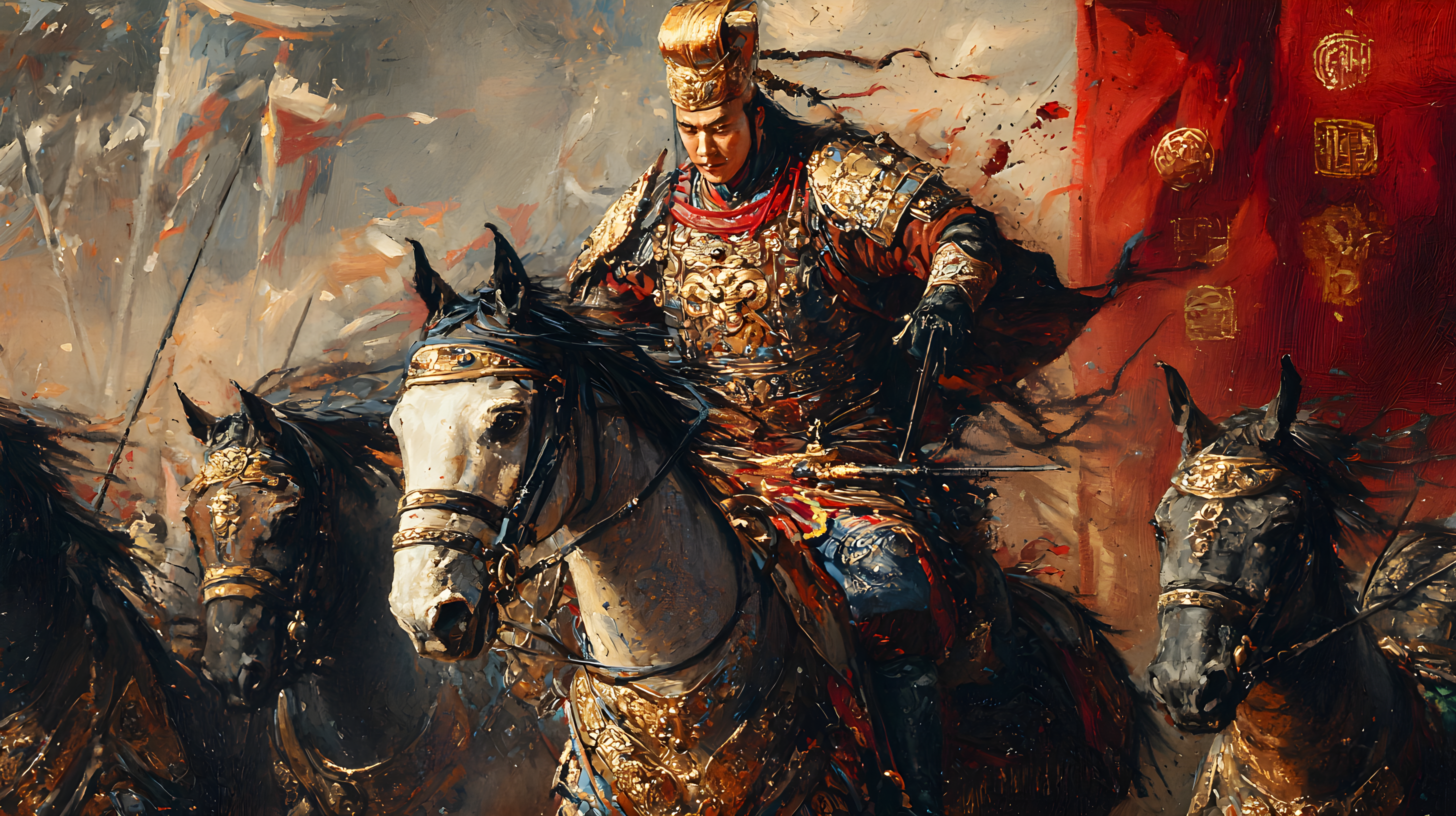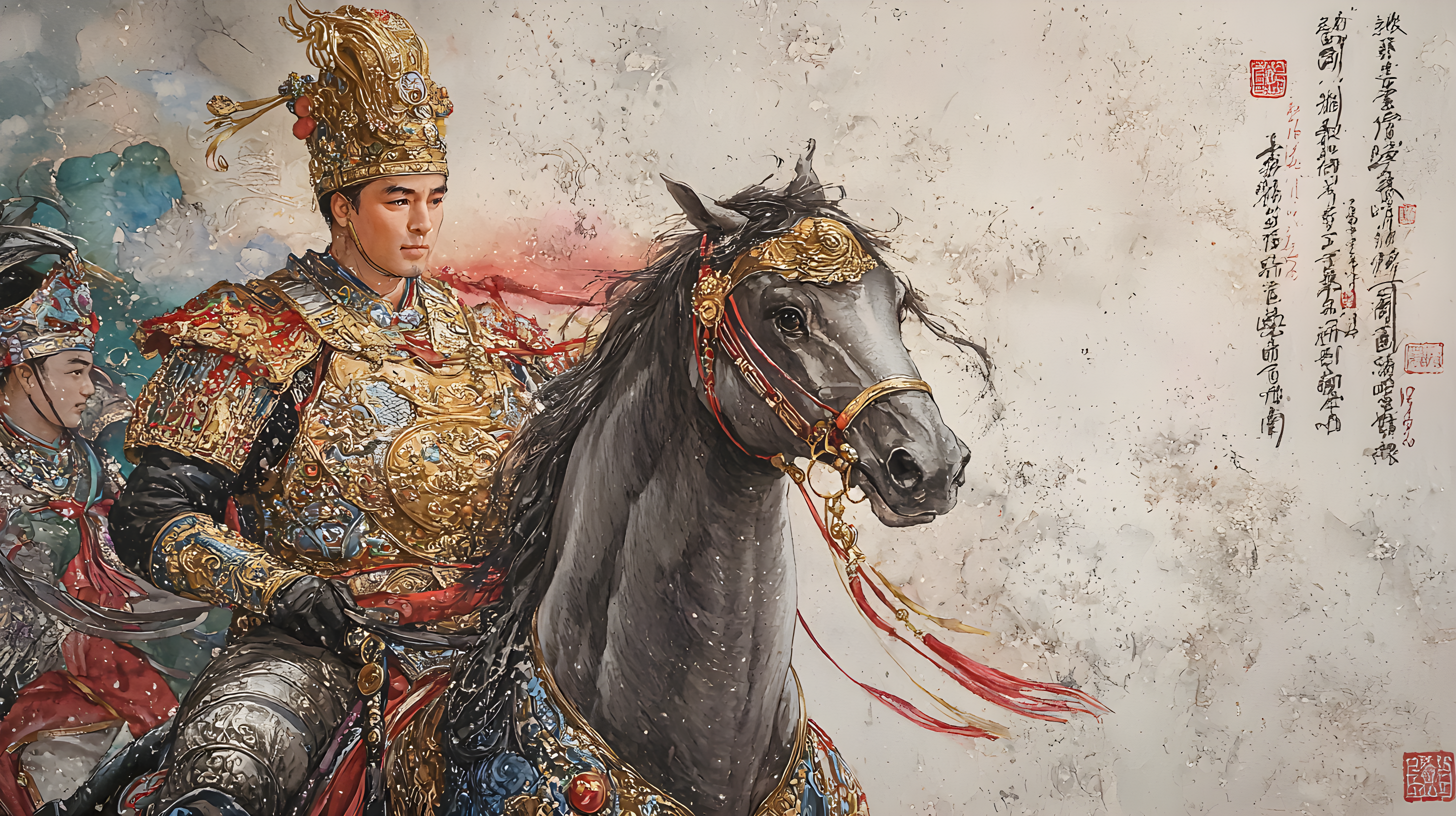 画中的乾隆皇帝头戴金盔,身穿铠甲,骑在骏马上,全副武装,佩带弓箭,展现了其作为皇帝的权威和威严。这种形象的描绘不仅展示了乾隆皇帝的军事力量,也反映了当时清朝政府对于军队建设的高度重视。