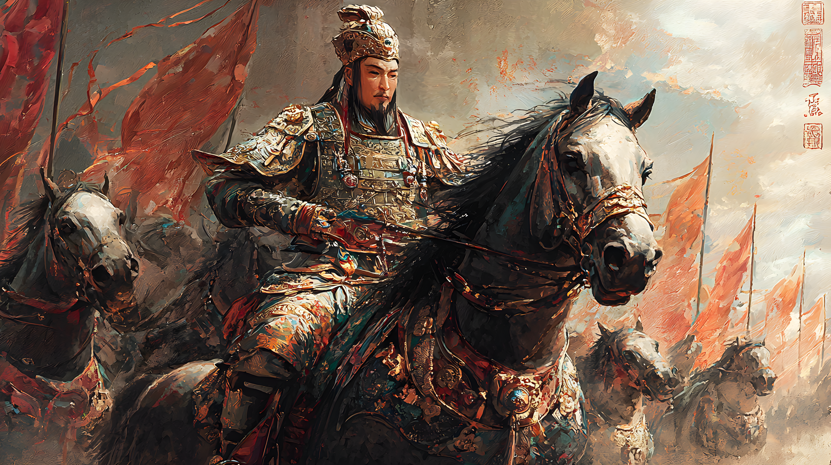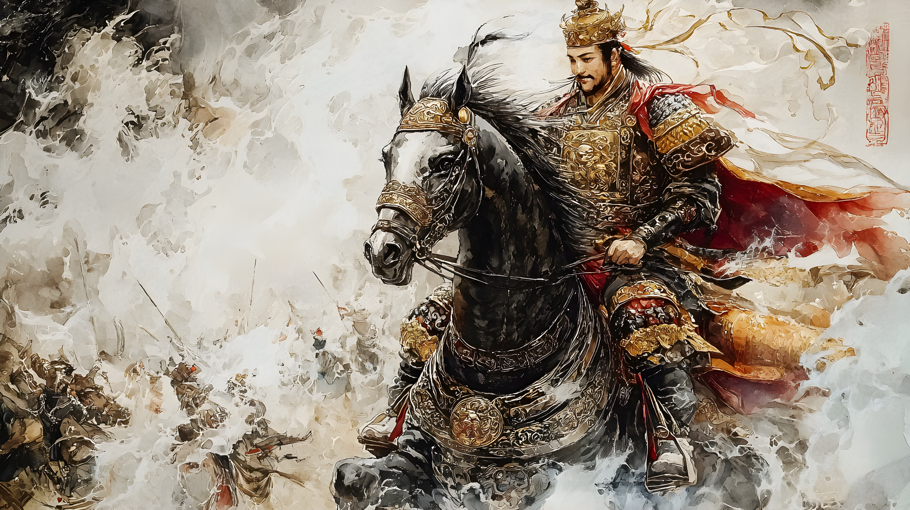 乾隆皇帝的大阅制度是清朝军事传统的一部分,通过阅兵活动来展示国威军威,提高军队的士气和战斗力。这幅画作不仅是一幅艺术作品,也是研究清朝军事历史和文化的重要资料。高清图片、8K。右上角有印章、题词。