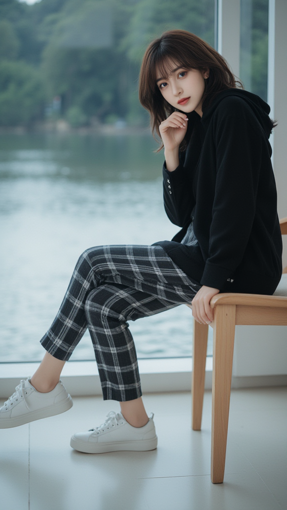 格文长裤女孩