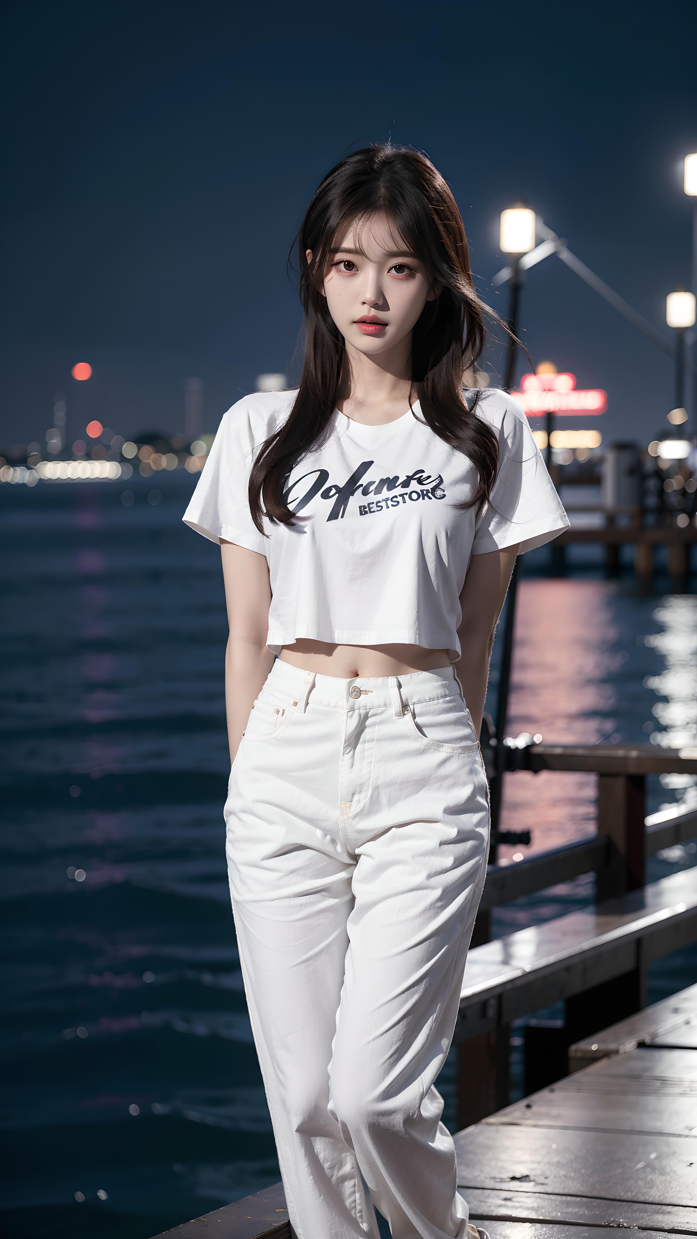 最佳构图大师级摄影工作室质量电影光效动态背景最佳画质一个绝世美女高冷黑色中等乱发超圆润的胸右眼上有颗雷痣半身肖像靠近镜头景深白色宽松T恤白色宽松休闲裤大白大长腿站立正面镜头羞涩的表情),在户外夜景海边公园正对镜头