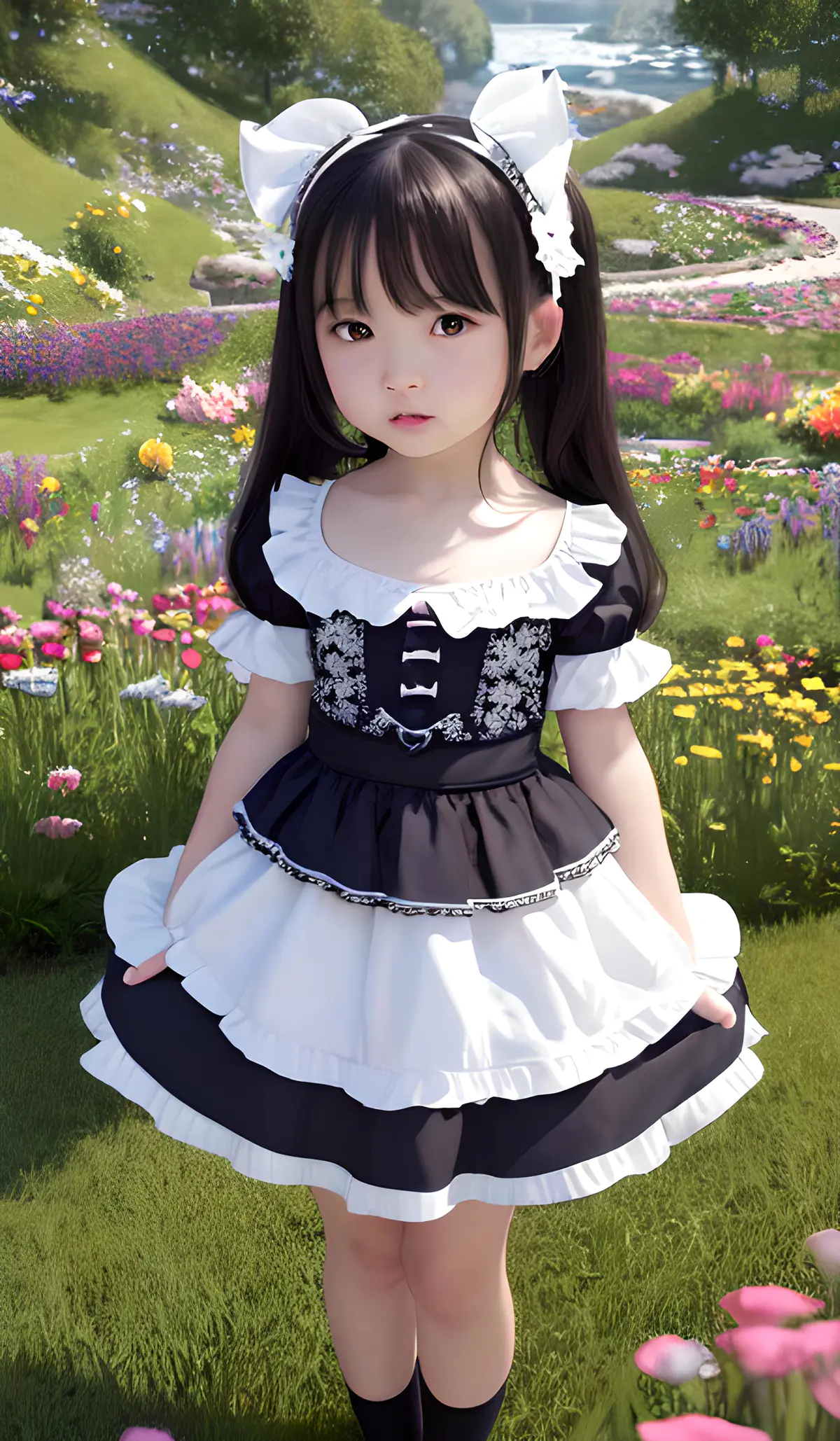 高质量,高细节,PBR渲染+UE引擎,杰作,高分辨率,精美壁纸,((小萝莉)),皮肤雪白,可爱,小圆脸,((娇小躯体)),(((大胸)),(洛丽塔裙)),白色长发,可爱,花海背景,