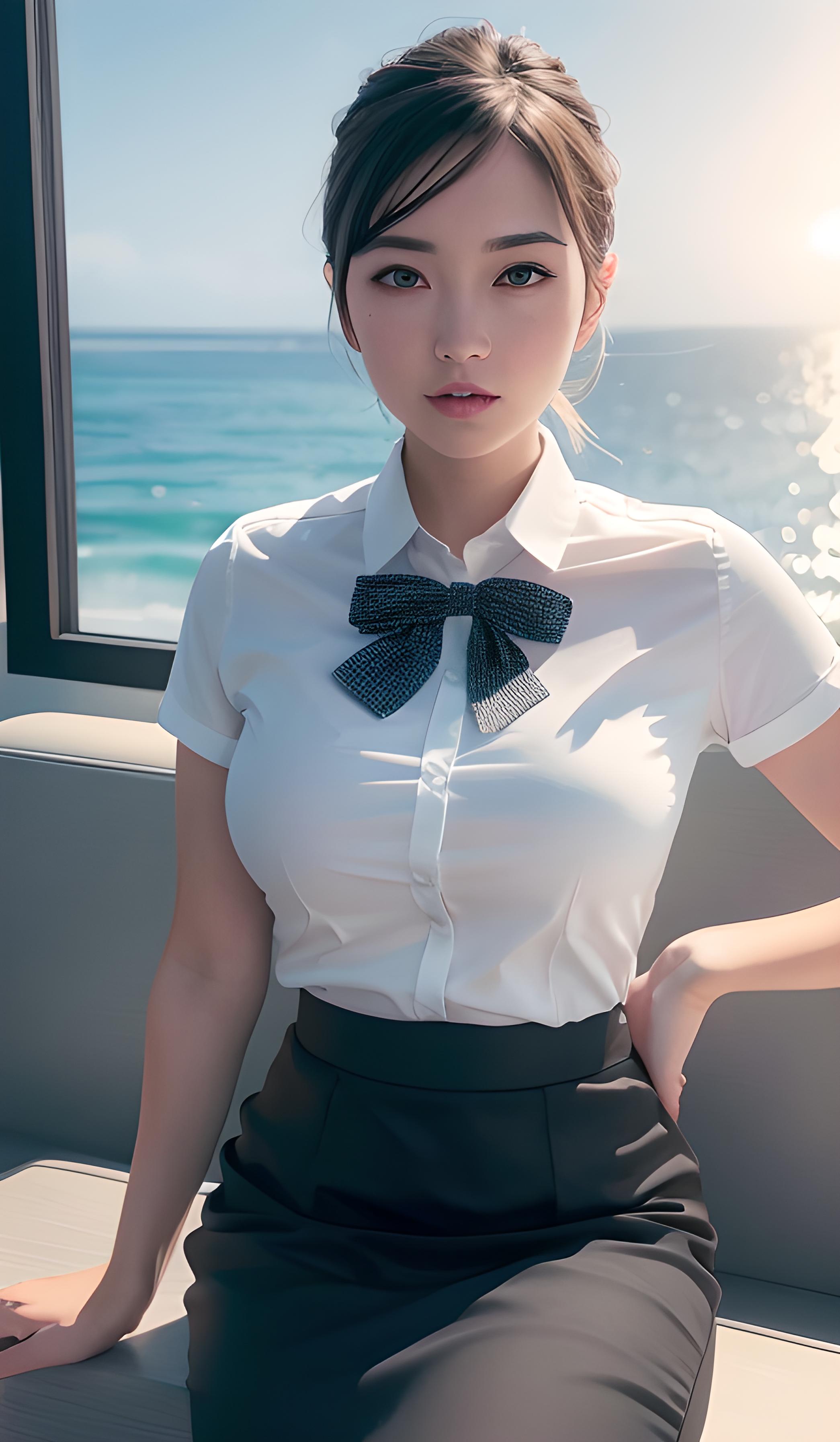 .3>,.2>(8k, RAW photo, best quality, masterpiece:1.2), (realistic, photo-realistic:1.37), ultra-detailed, 1 girl,cute, solo,(big_breasts),beautiful detailed sky,beautiful sea,detailed cafe,night,sitting,dating,(nose blush),(smile:1.1),(closed mouth) medium breasts,beautiful detailed eyes,(collared shirt:1.1), bowtie,pencil skirt,(short hair:1.2),medium hair