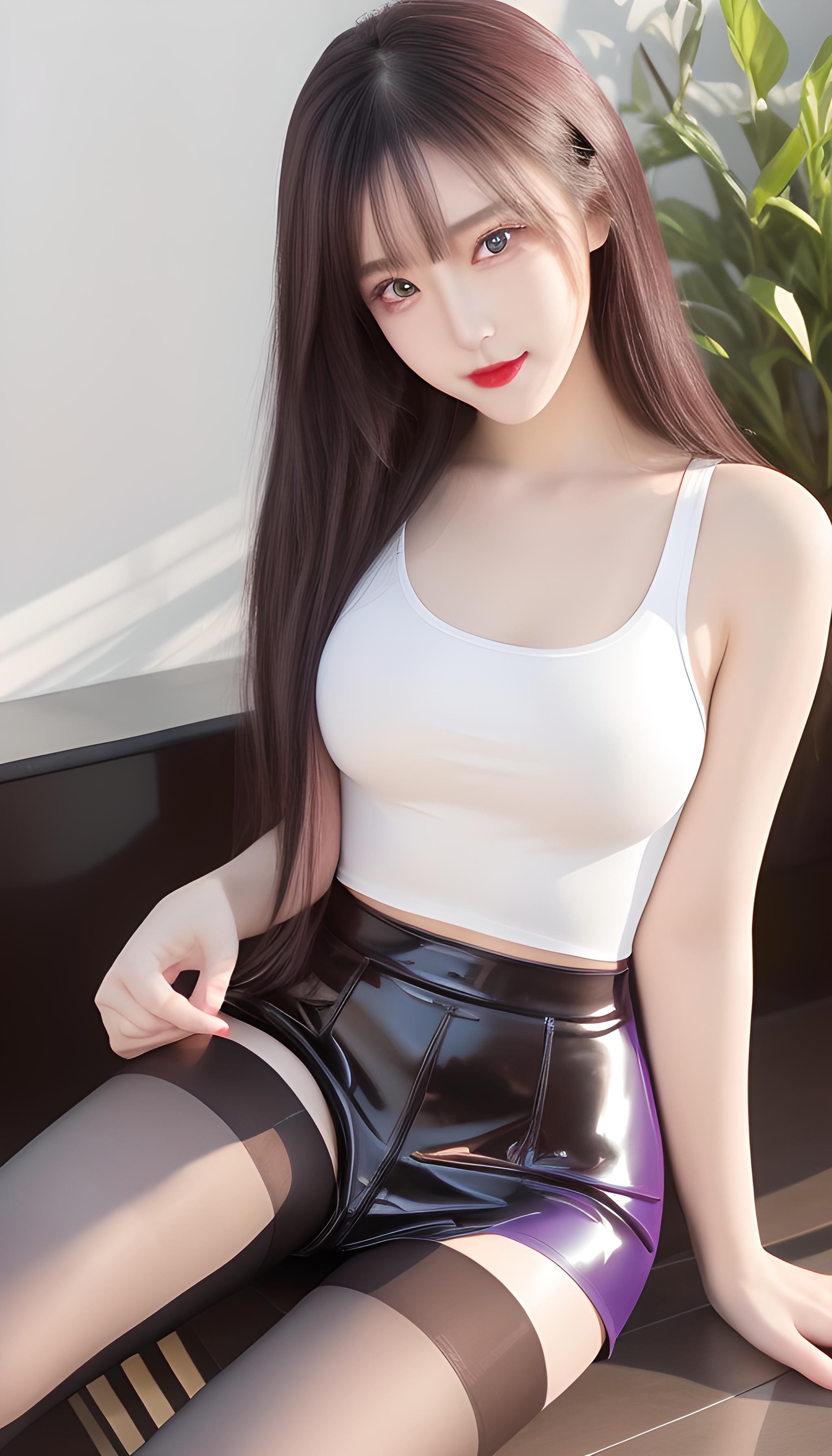咒语(Prompt): 高清,青春靓丽的少女,8k画质,最佳画质,巨胸,丝袜带字母,红色丝袜,蓝色丝袜,细腰,精致五官,非常可爱,水汪汪的大眼睛,紫色瞳孔,眼影,长睫毛,脸红,红色嘴唇,,银白的头发,超短裤,全身特写,(现代),超现实,阳光明媚,细节光线,优雅的姿势,(latex dress,hotpants,tank top),((grey_pantyhose)),细节丰富,微笑,害羞,可爱,动人美女,